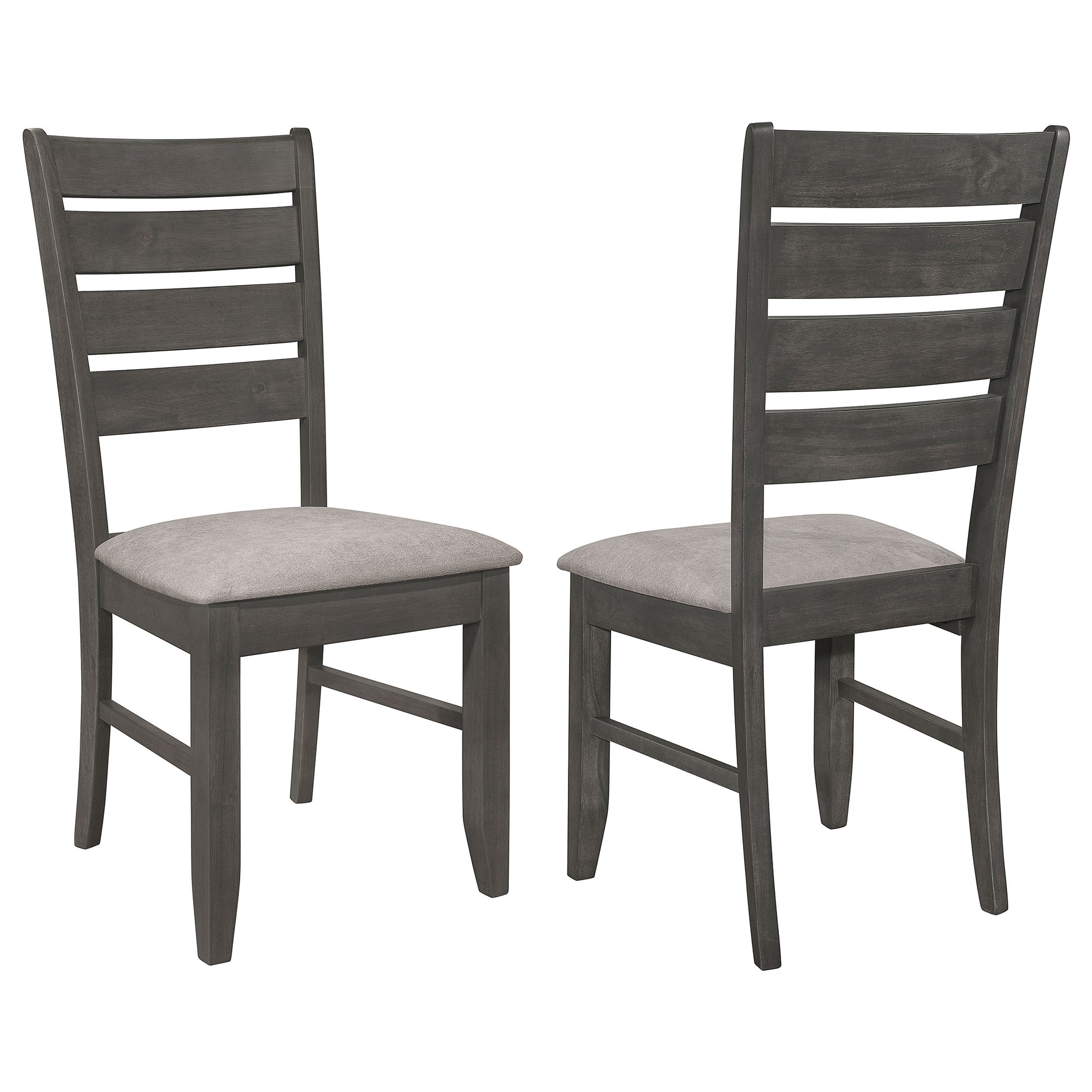 This set of two grey padded seat side chairs is perfect for adding a modern touch to your dining room or kitchen. Featuring sleek tapered slat backs, these chairs are ideal for casual dining and entertaining guests.