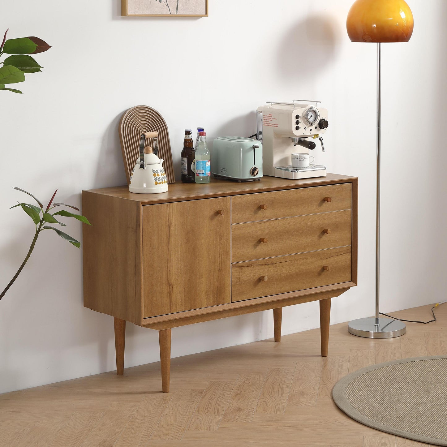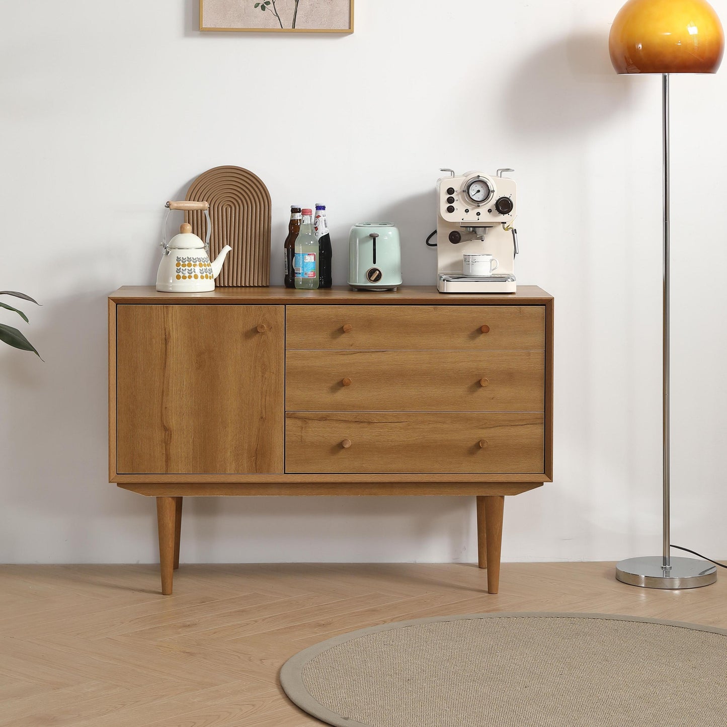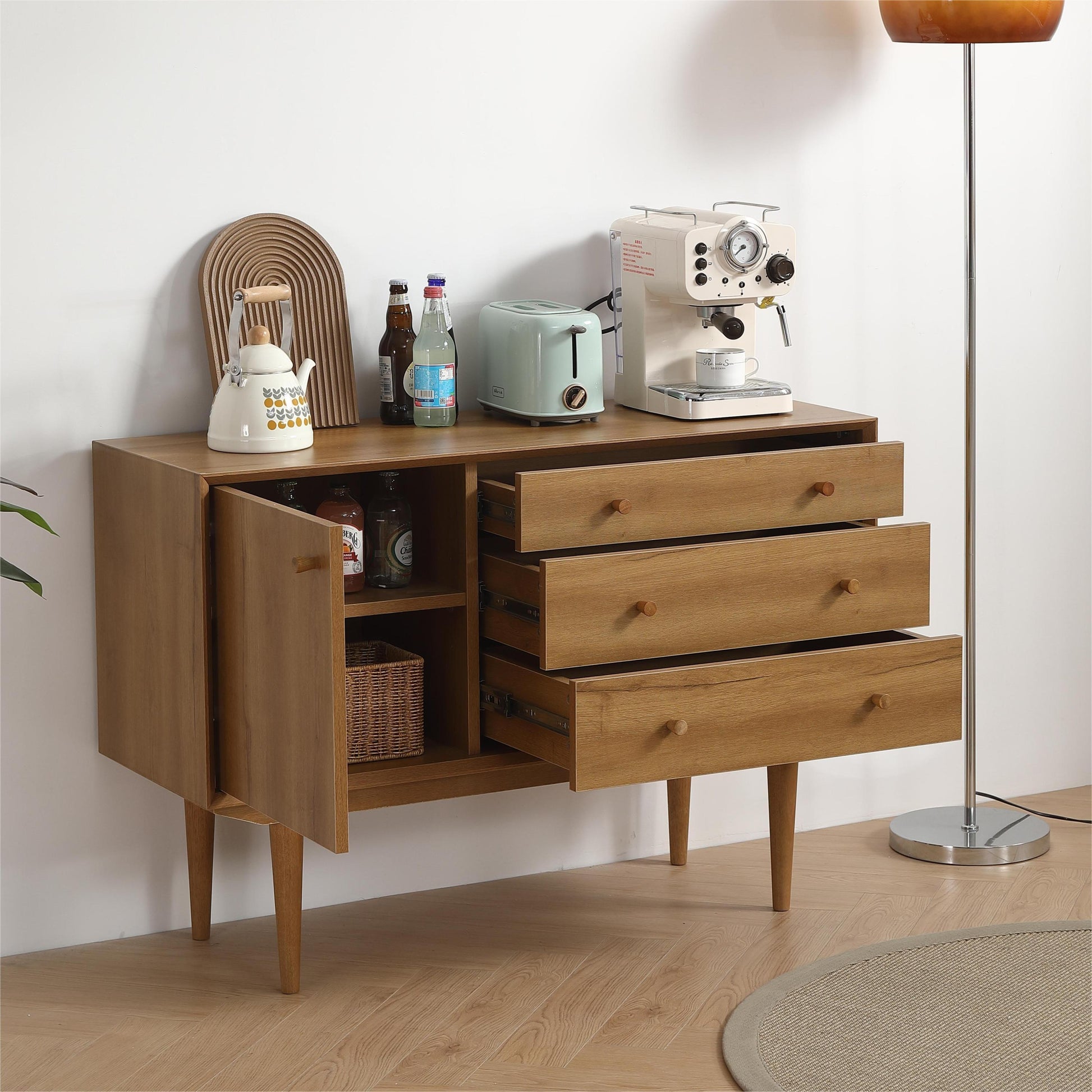 - Generous Storage Solutions: With a spacious cabinet that includes an adjustable shelf and three large drawers, this sideboard offers ample storage options for your dining essentials. Whether it's tableware, linens, or decorative items, everything finds its place in this well-organized unit, ensuring your dining area remains clutter-free and stylish.