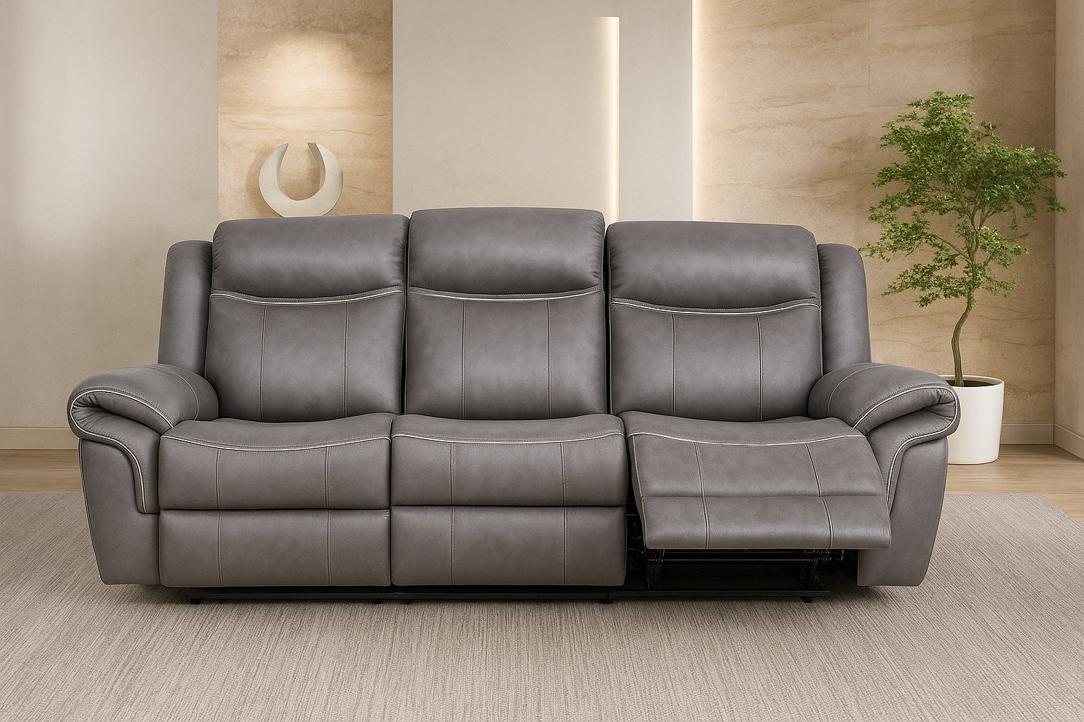 The Agata Manual Reclining Sofa brings everyday comfort, durability, and warm neutral style to your home. Upholstered in a soft warm gray leatherette, this sofa features dual manual recliners, plush cushions, and tailored contrast stitching that elevates its transitional silhouette. A solid wood frame ensures long-lasting structure, while the built-in drop-down center table provides cupholders and added convenience for movie nights and daily lounging.
