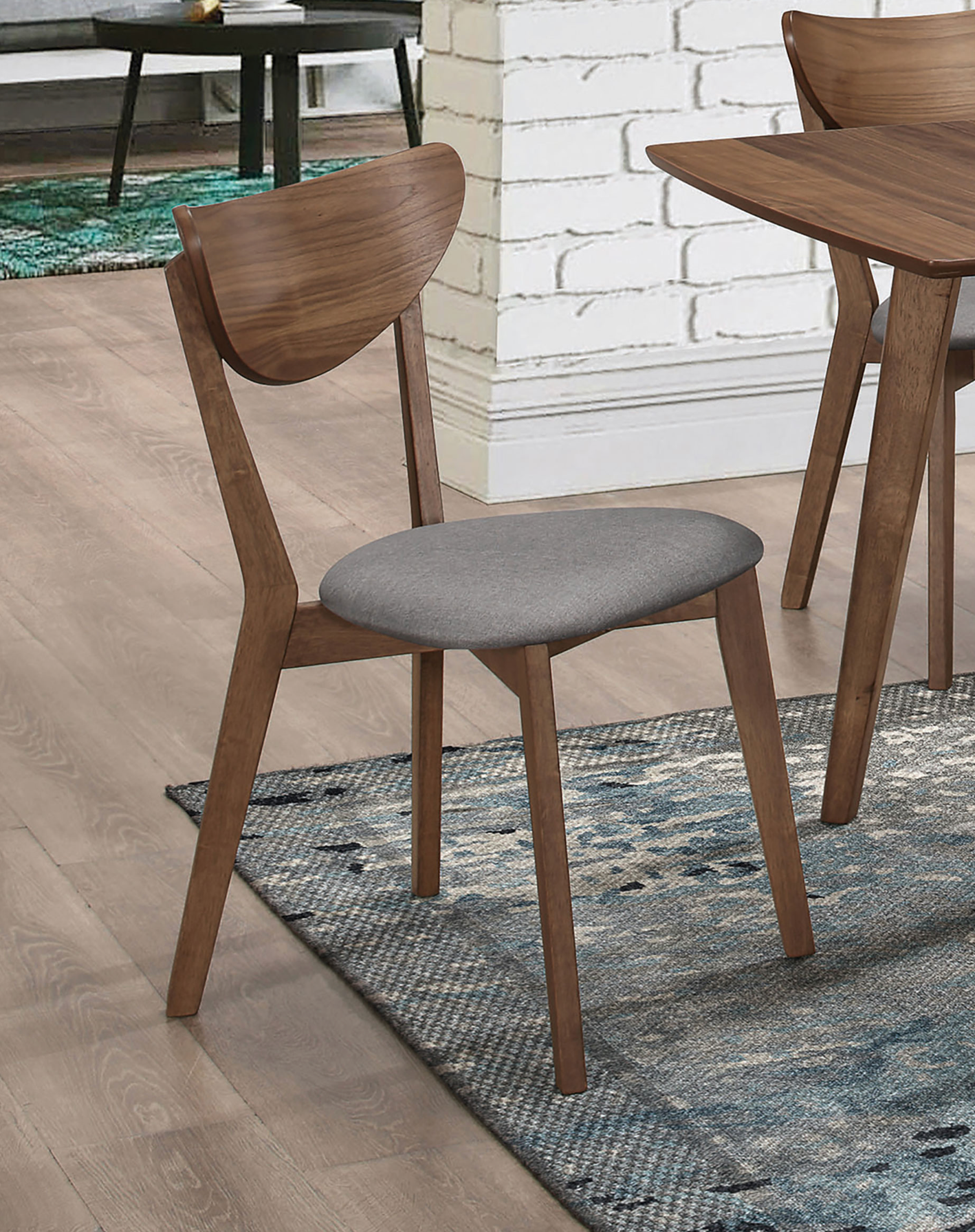 Bring a touch of retro-inspired charm to your dining space with the Alfredo Dining Chairs (Set of 2) by Coaster Fine Furniture. These mid-century modern side chairs showcase the best of 1960s design—clean lines, angled legs, and gentle curves—all crafted with solid rubberwood in a natural walnut finish. Soft grey upholstered seats provide comfort for everyday dining, while Danish-style backrests lend casual elegance and versatility that fits both contemporary and vintage-inspired interiors.