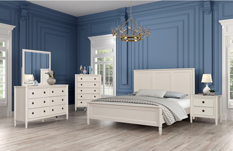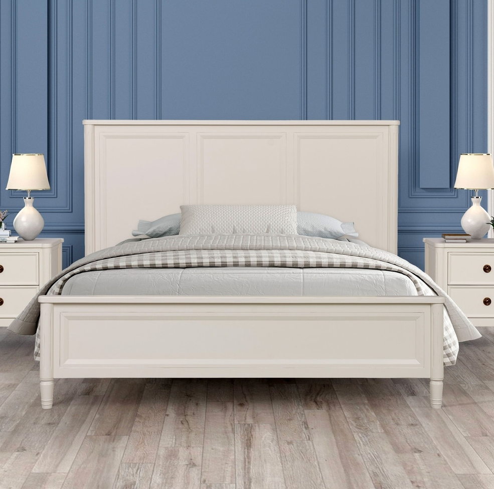 The Altamira French Modern Panel Bed from the Altamira Collection features a solid wood construction and a 3-panel headboard with a beveled edge, capturing the essence of modern French style. Its exquisite detailing, including turned posts and antique gold hardware, adds an elegant and sophisticated touch to any bedroom. Available in both blue and white, with a full range of matching bedroom pieces.