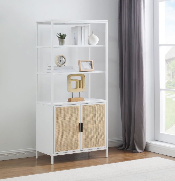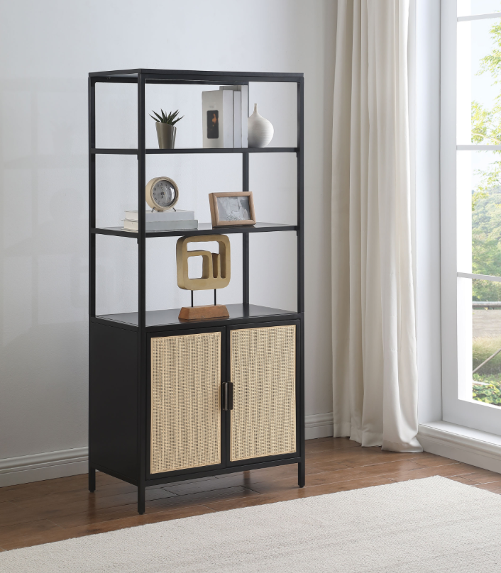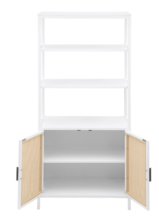 Elevate your storage solutions with this stylish two-door tall accent cabinet, expertly crafted from durable metal for long-lasting support. The sleek powder-coated finish adds a modern touch while providing excellent resistance to scratches and wear. The polyethylene (PE) rattan door fronts bring a hint of coastal charm, adding natural texture to your decor. With three tiers of open shelving, this cabinet offers ample space for displaying decor, books, or essentials, while the enclosed cabinet with a fixed shelf provides additional storage for items you want neatly tucked away. This versatile piece seamlessly combines function with style.