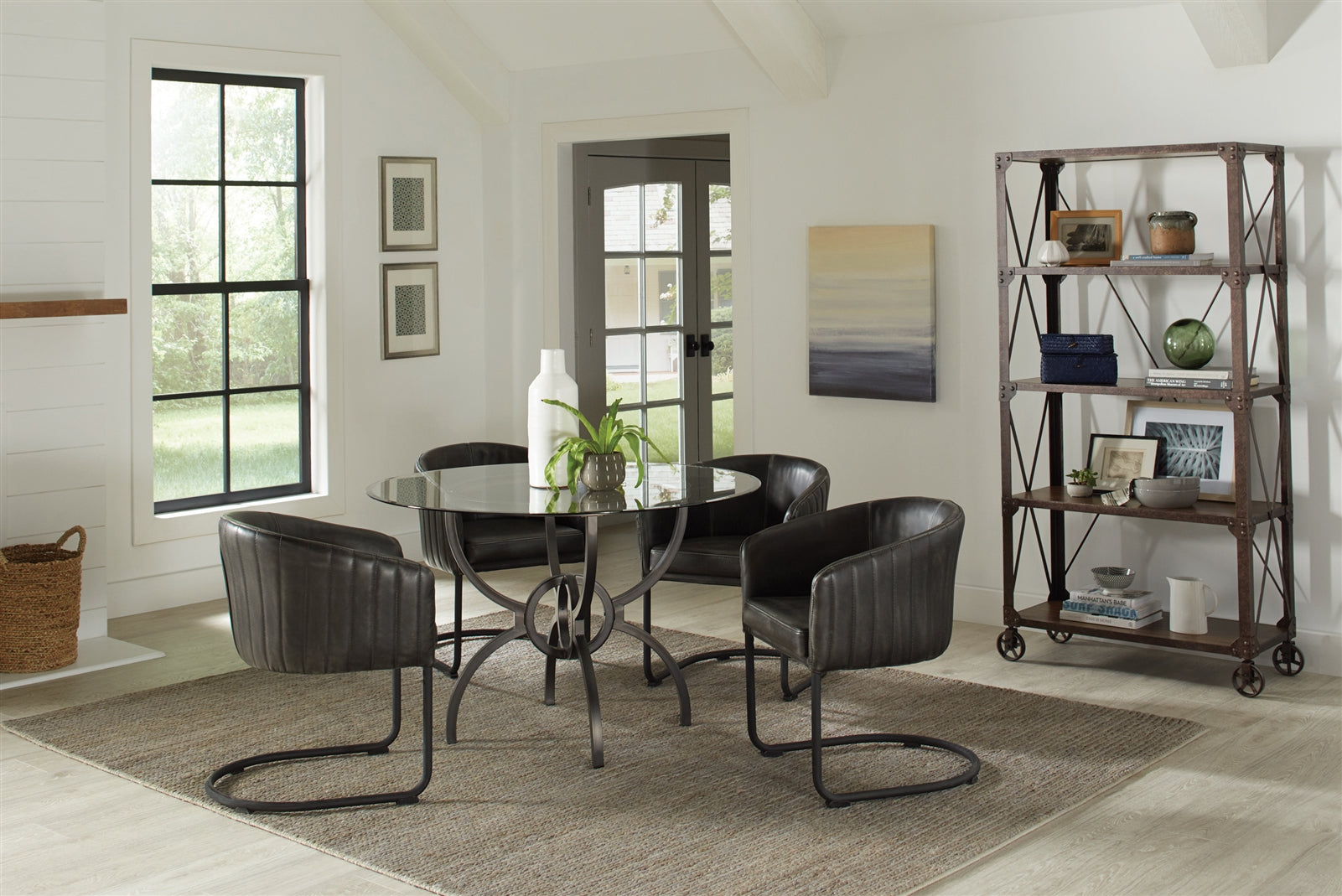 Celebrate eye-catching style in your dining room with this 5-piece dining set from the Aviano collection. A round tempered glass tabletop makes the most of available space, while highlighting the sculptural appeal of the table base. The table base displays an exquisite design of curves meeting around center rings all in a rich gunmetal finish. Cushioned barrel shape chairs are plushily upholstered in supple anthracite leatherette for the ultimate comfortable dining experience. This set is the perfect space-saving solution for a casual contemporary dining room.