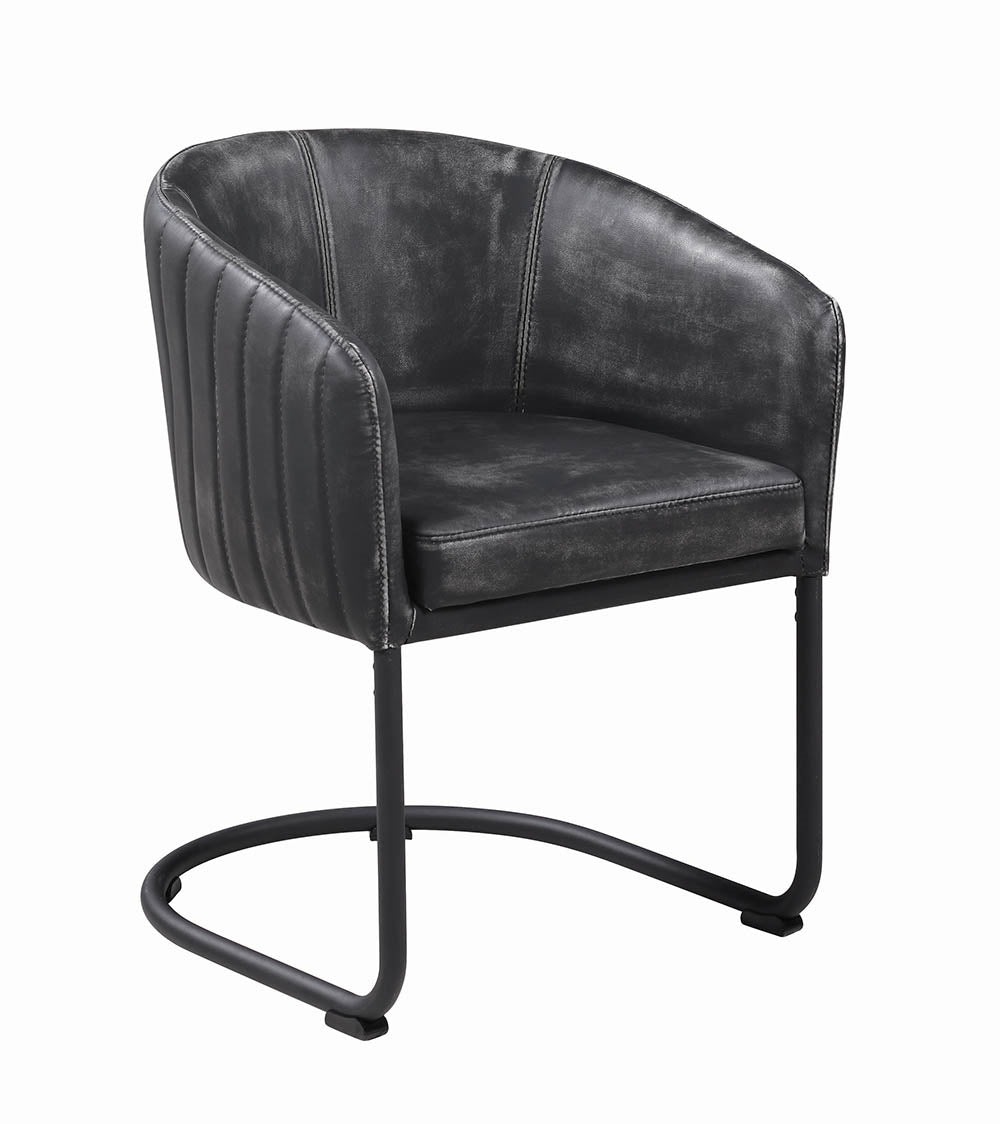 A sled base and barrel-back seat create striking contrast for this transitional style dining chair. The dining chair is constructed of deep black powder coated metal and features Anthracite faux leather upholstery finished in black. Both elegant and modern, this dining chair is a fit for many decors.