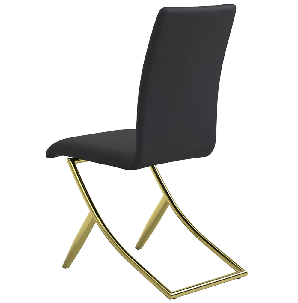 Embrace contemporary elegance in the dining room with this armless dining chair. The sleek design boasts a gracefully contoured leg frame with an upholstered seat and back. The classic glamour of a shiny brass finish on the legs complements the leatherette upholstery. Choose the color that suits your decor, or mix and match for a fun look. Perfect with a glass top dining table for a dramatic contemporary feel.