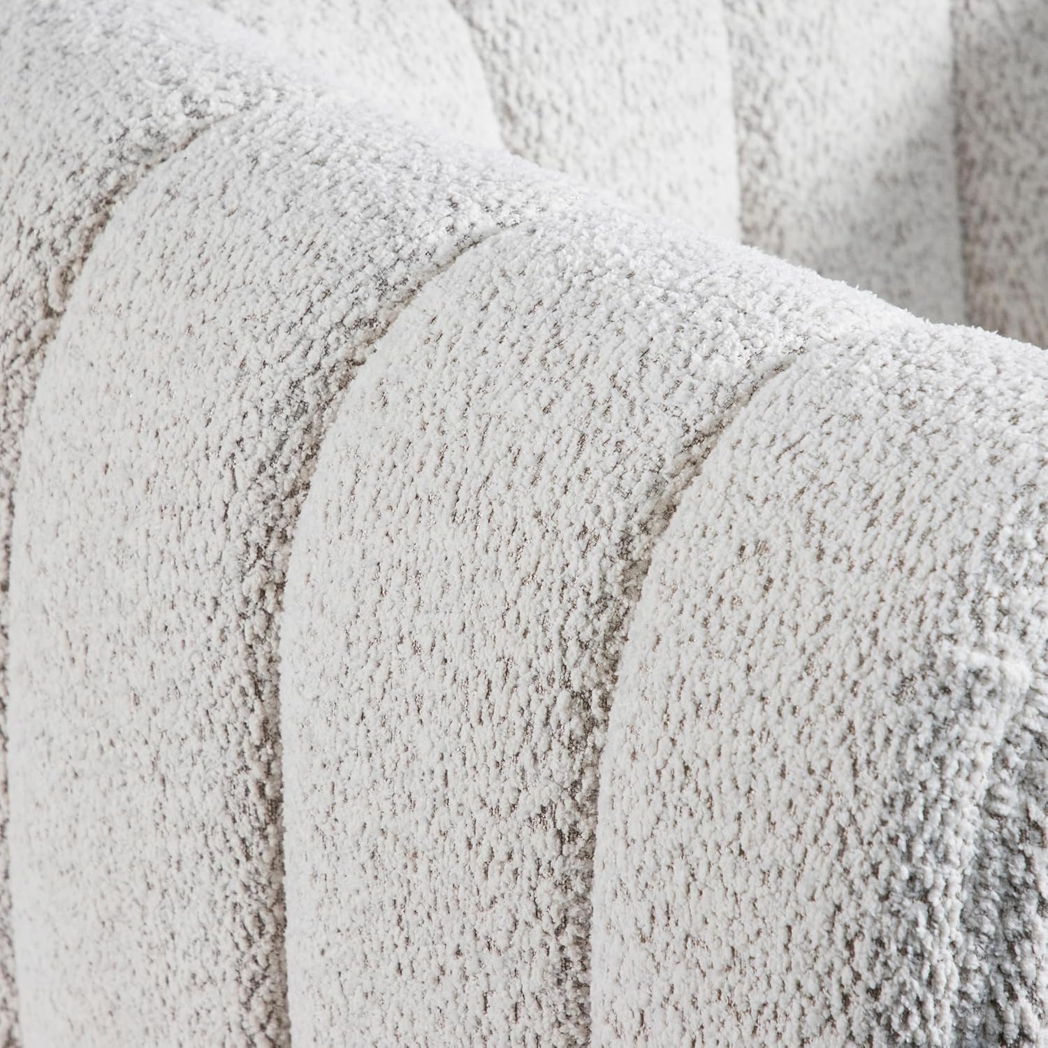 Aversa Bouclé Living Room Collection — For the daring ones, this collection blends retro vibes with modern lines for a true standout. Clean, straight silhouettes are elevated by chic vertical channel tufting that wraps the single bench seat and back. Generously padded arms and smooth bouclé upholstery deliver sink‑in comfort while keeping the look crisp and contemporary.