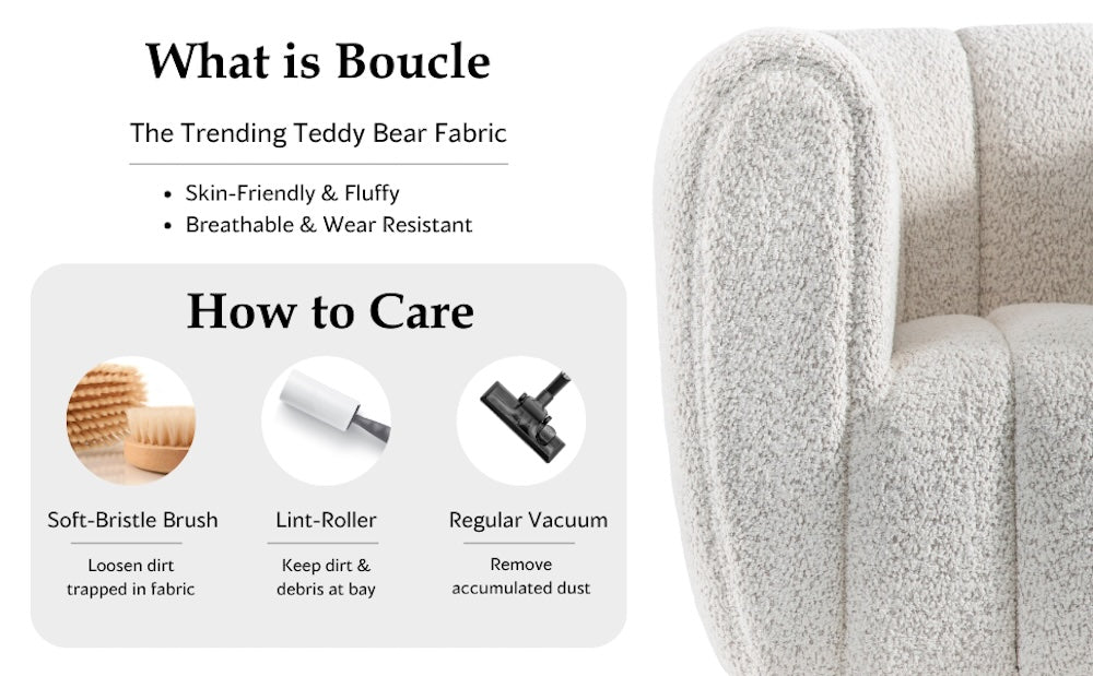 - Smooth bouclé upholstery with subtle metallic undertones (100% polyester)
