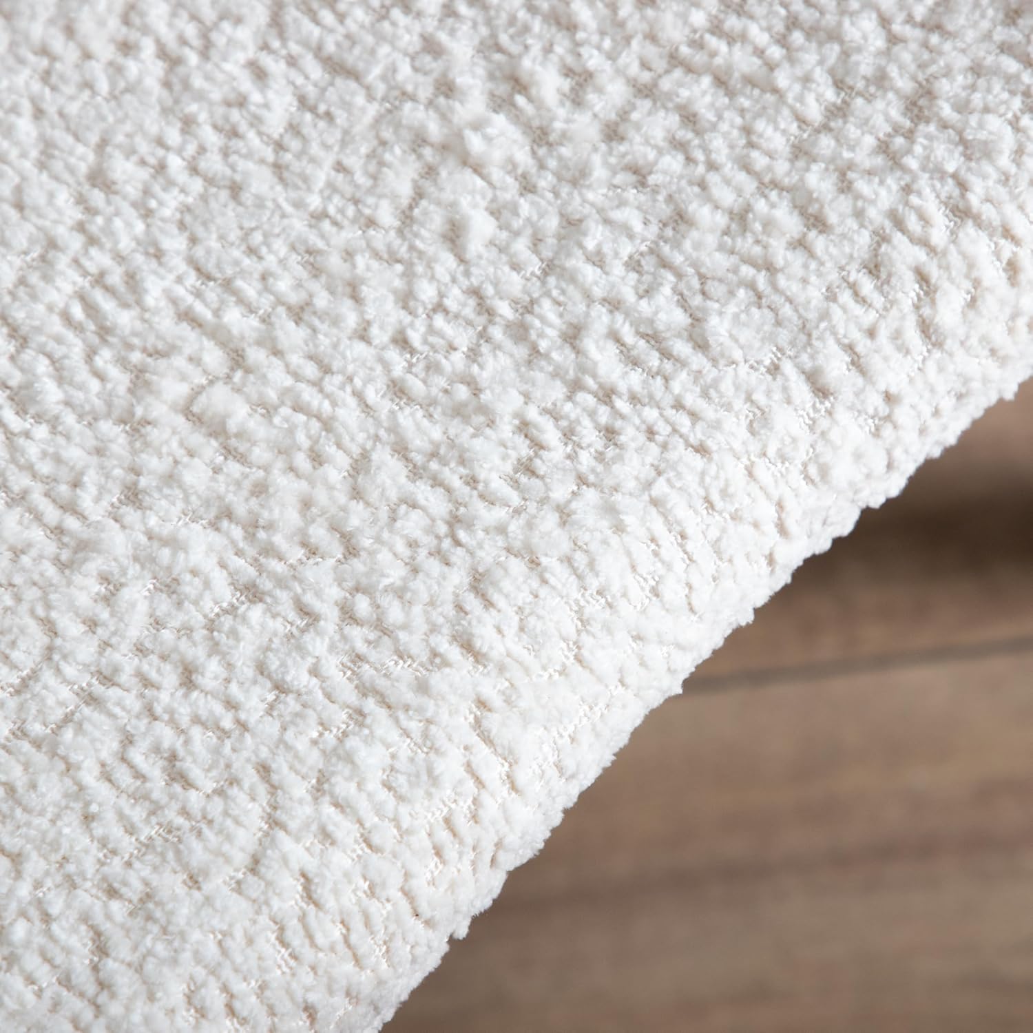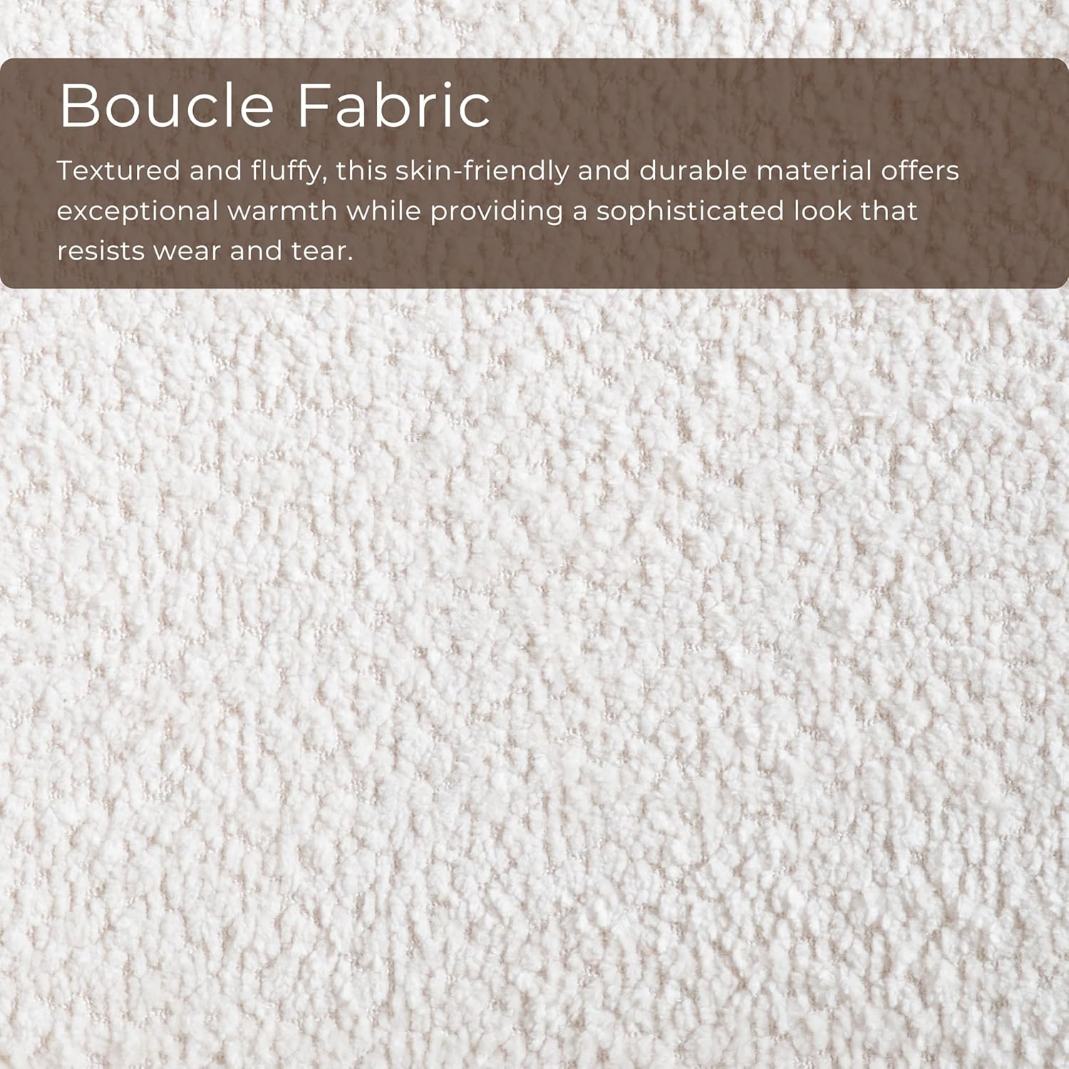 - Upholstery: Beige bouclé fabric with faux leather accents
