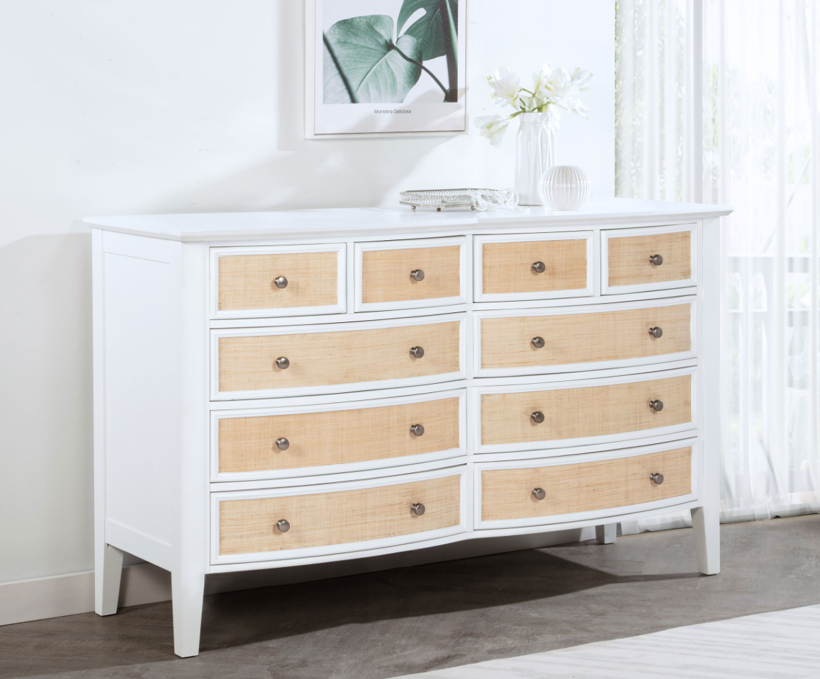 Play up approachable coastal character with a modern ten-drawer dresser in your bedroom. It shows off a gently double convex curved profile, complemented perfectly with a bright white finish that lends casual elegance. Each drawer front is adorned with natural rattan that offers the perfect dose of texture and character. Petite round knobs complete the look to perfection. Abundant drawers include four smaller felt-lined top drawers and six larger lower drawers, creating a perfect blend of storage for clothing, accessories, and personal effects.