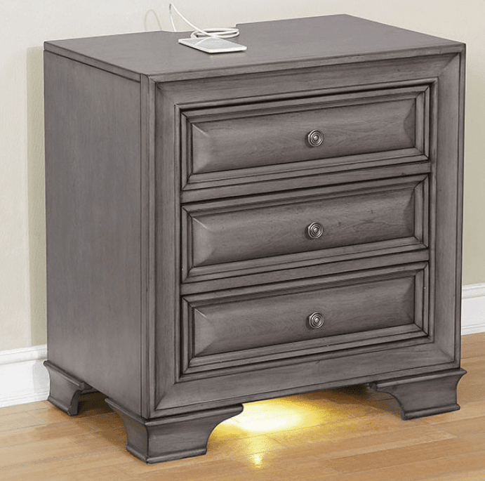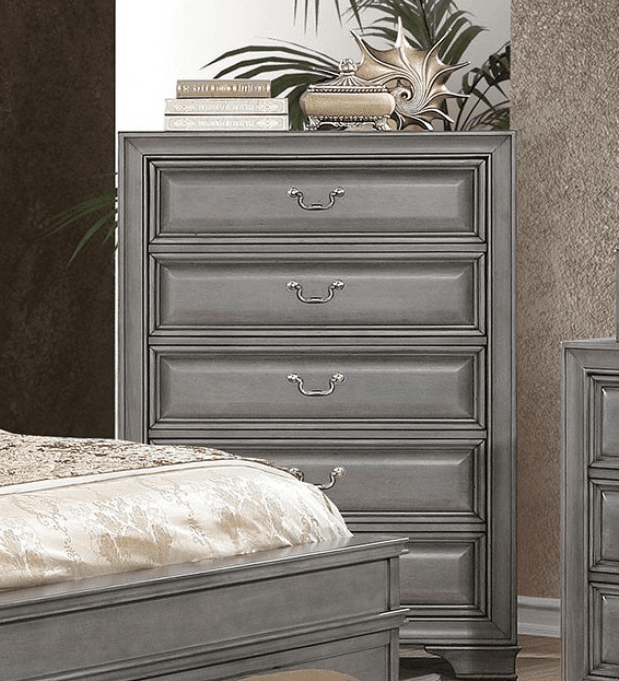 This bedroom set offers two solutions at once. It is visually stunning, and has unrivaled storage space to keep your fabulous new room clutter free. This bed's main attraction is not the solid panel curving headboard but the pairs of drawers integrated into the footboard and side railing. The gray finish and antique hardware of this piece gives it a subtle elegance.