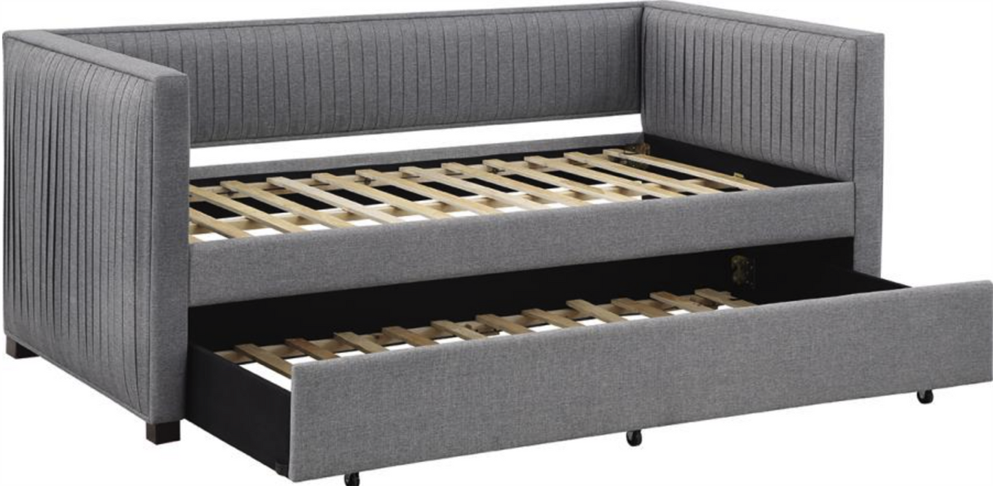 | With its thin, pleated, fabric details, this shelter back daybed features exceptional tailoring throughout * Relax in comfort with this sleeping, lounging, daybed must-have * Perfect for smaller living areas, convenient pull out trundle for extra sleeping space when needed * Upholstered in grey fabric * Frame constructed with pine and MDF * Slat kits included |