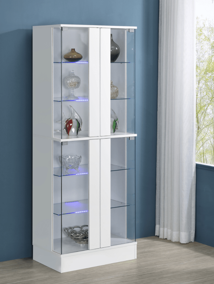 Discover sophistication and functionality fused in this sleek curio display cabinet, a stylish centerpiece for any room. The high gloss laminate on engineered wood gives a luminous sheen, complemented by clear tempered glass doors that encase six tiers of shelving. Each shelf basks in the glow of integrated LED lights, perfect for showcasing your treasures with a touch of modern elegance. The two-door design invites a clear view into your curated collection, while the robust construction promises longevity. This cabinet is not just furniture; it's a statement of refined taste and practical luxury.