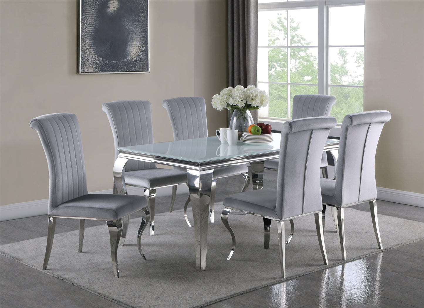 Experience the Carone dining set, seamlessly fusing modern design with timeless elements. The table's stainless steel legs bring sophistication, curving artistically and contrasting the 12mm tempered glass top with beveled edges. Hosting formal feasts is effortless on this table. Complementing this, the elegant dining chairs exude sleek sophistication. Their chrome-finished legs, including creatively curved front legs, offer a captivating shine. Luxe velvet upholstery graces the seats, available in various colors to personalize your space. Elevate your dining area with the Carone collection, where innovation meets opulence.