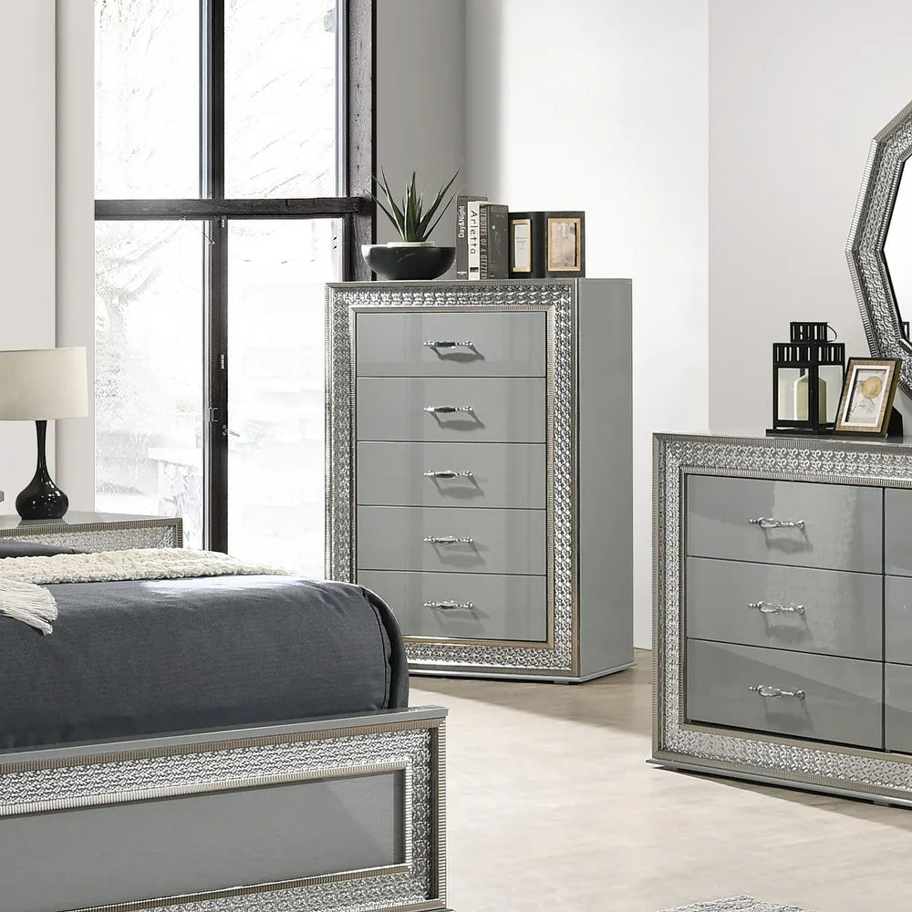 The Cassiopeia Glam Collection combines captivating elements and opulent design. Available in king and queen sizes, the bed features a 7-ray headboard backlit by LED lights in a metallic gray finish. Complete the look with a variety of coordinating case pieces included in this collection.