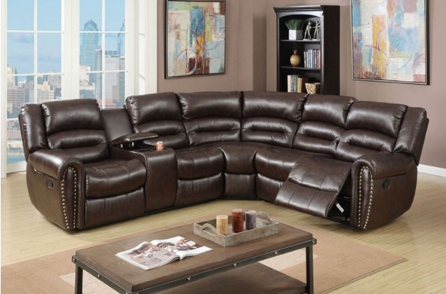 This spacious 6-seat reclining sectional features plush three-tier pillow backs, generously wide seats, and smooth bonded leather upholstery for a luxurious feel. Silver nailhead trim along the arms adds a touch of classic elegance, while a built-in console with storage and dual cup holders brings added convenience to your living space. Available in classic black or warm brown to suit any dΓ©cor.