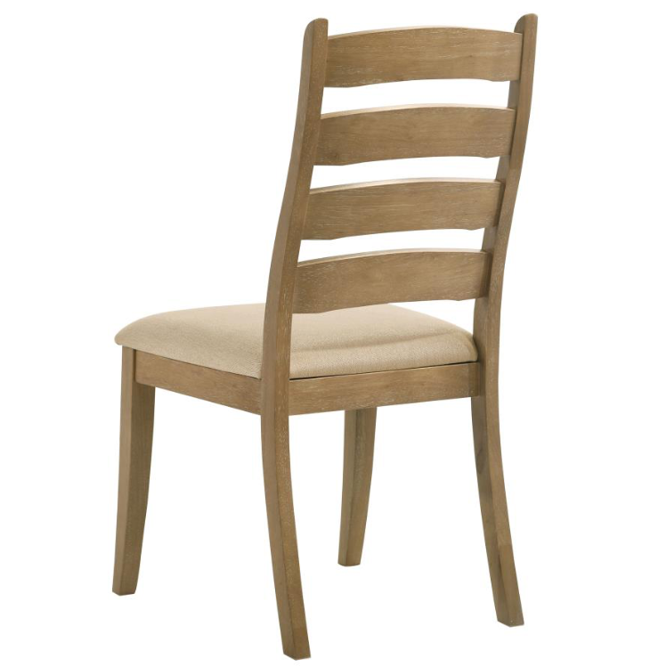 Put finishing touches on an inviting kitchen or dining room table with a set of two modern farmhouse dining chairs. Each boasts an armless silhouette with a ladder back design that adds timeless character. The warm brown oak wood grain finish is classic, ensuring an inviting presence in your space. The chairs are complete with foam padding over their seats, covered in neutral beige upholstery. Choose these chairs to enhance a welcoming kitchen table.