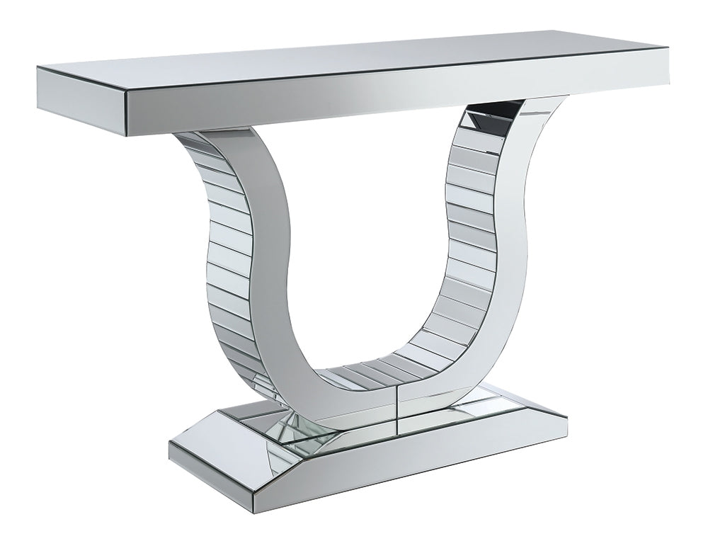 Stunningly sleek, this modern console table dresses up any living room or entryway. Full of glitz and charm, this table opens up spaces with a bright silver finish and mirrored accent pieces. Elongate a space and add depth with the open curve of the base. With a sleek top and bottom, the silhouette welcomes a balanced and glamorous feel into any motif. Add a contemporary touch to any space with the bright shades and reflective details.
