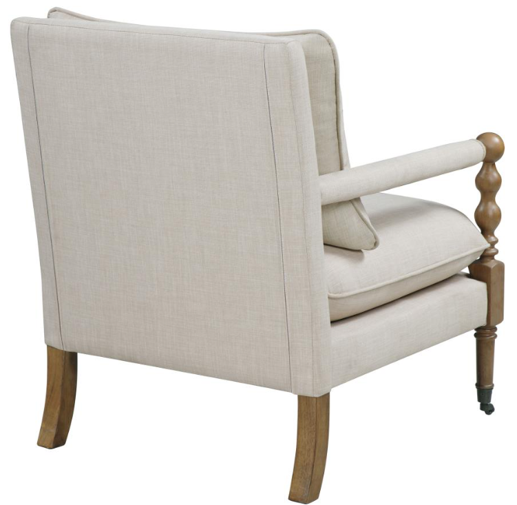 Introduce stylish comfort to a master suite or living room seating area. This upholstered accent chair features wonderful linen-line fabric that elevates its inviting style to new heights. Exposed wood framing in a dark oak finish draws the eye and offers a touch of contrast. The chair features a plush seat and back pillow, with covered arms that add comfort. Curl up with a book or catch up with a friend