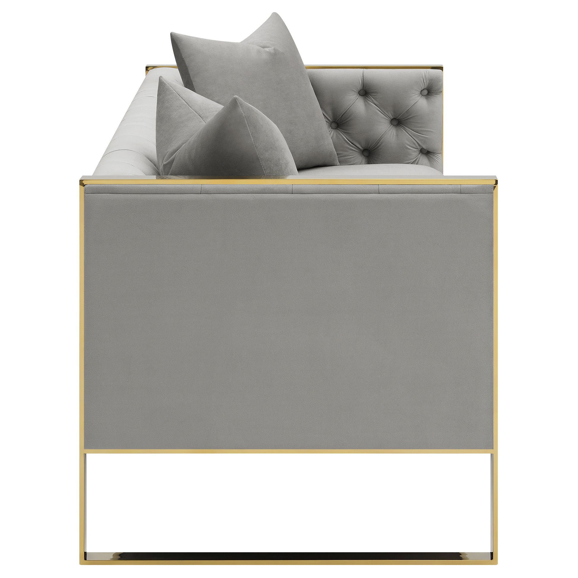 Glamorous and stylish, this sofa and loveseat offers a formal touch of Hollywood Regency to a home. Both seats and wrapped in a light grey velvet upholstery, nestled by a sleek stainless steel arm and base in a lustrous gold finish. Each piece also offers a shelter style backrest and arms, with a button tufted interior. Each bottom cushion offers a smooth, yet tight waterfall style bench. Included in this set are four matching accent pillows.