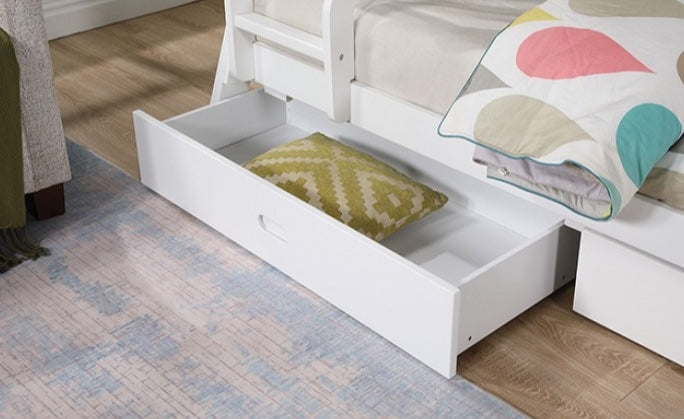 Expertly designed and crafted, the Emilee Twin over Full Bunk Bed offers both style and function. With a reversible angled ladder and two under bed storage drawers, this solid wood bunk bed maximizes space and convenience. Its full slatted design ensures mattress readiness. Available in multiple colors.