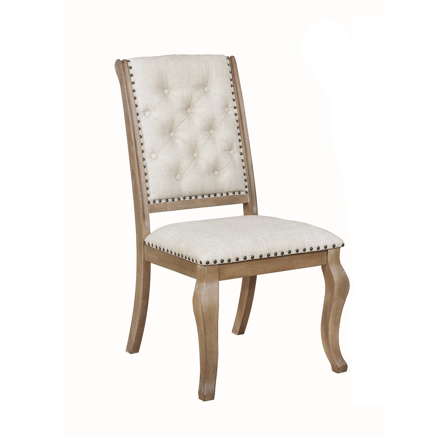 Nail head trim lends a refined presence to this tufted side chair. Ideal for a stylish dining room, this char features a plush, wide seat for optimal comfort. Its upholstered back is button tufted in a classic diamond motif, creating exceptional texture and depth. Cream-colored fabric ensures clean, neutral appeal to boost the style factor in any space. Crafted from Asian hardwoods, the chair is complete with a barley brown finish that's soft and inviting.