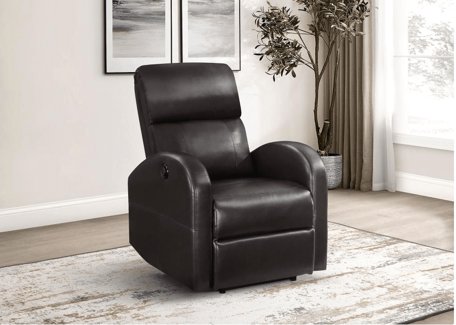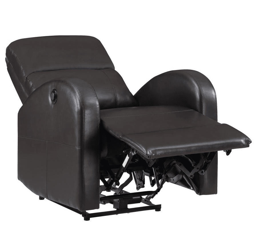 Create the perfect place for stylish lounging with a modern power recliner in your den or living room. It delivers a compact silhouette, offering on-trend style, with neutral faux leather upholstery. Its tall, slim back and plush seat feature foam cushioning, ensuring excellent comfort whether enjoying a movie or catching up with a friend. The power recline functionality is operated with buttons on the right-hand side, ensuring smooth performance. It's complete with track arms with an upward sloping profile perfect for contemporary and modern living spaces.