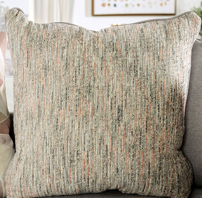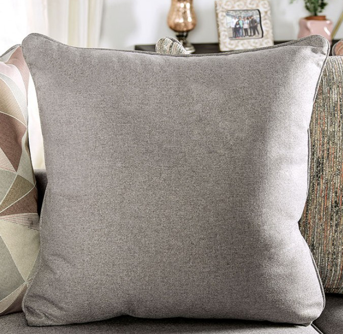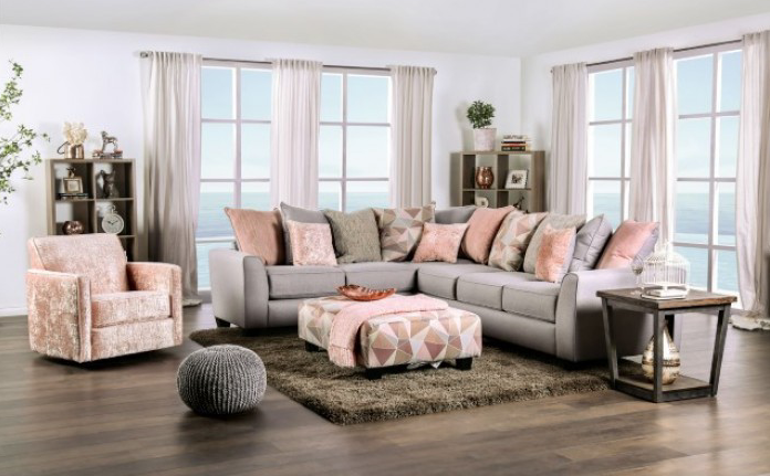 What an elegant ensemble, an assortment of pastels ready to transform any large space into a showroom masterpiece. The neutral gray sectional provides the base from which the theme corresponds. Zippered cushions are reversible and the wide subtly-flared shelter arms are fully padded. A wild abstract-patterned ottoman, delightfully hued swivel chair, and a varied assortment of pillows provide a delicate contrast that is undeniably cohesive when aesthetically arranged.