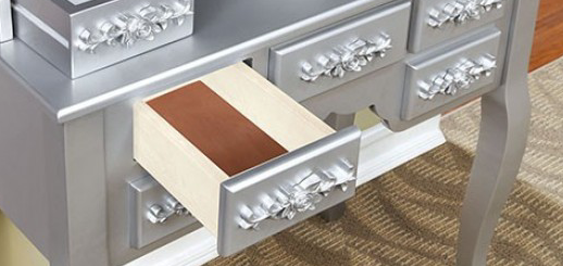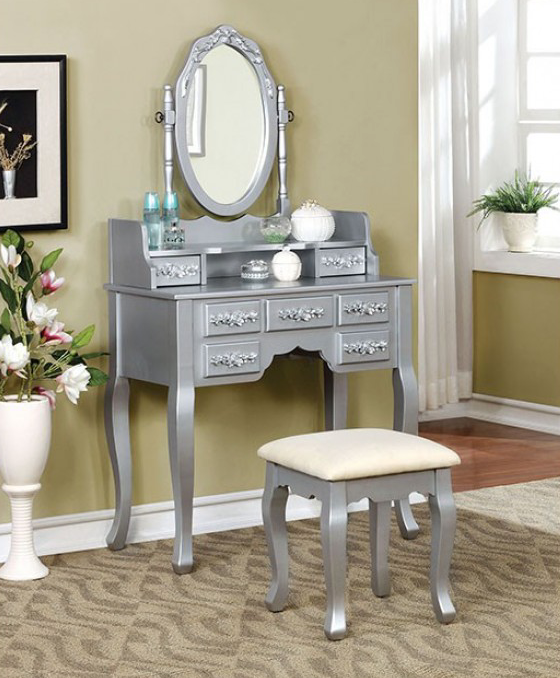 Start your day in front of this vanity set! This transitional vanity table proudly displays gently curved legs that help draw attention to the carved details on the drawer panels. Spread out your makeup and beauty products across the two shelves or in the multiple drawers so everything is in one place.