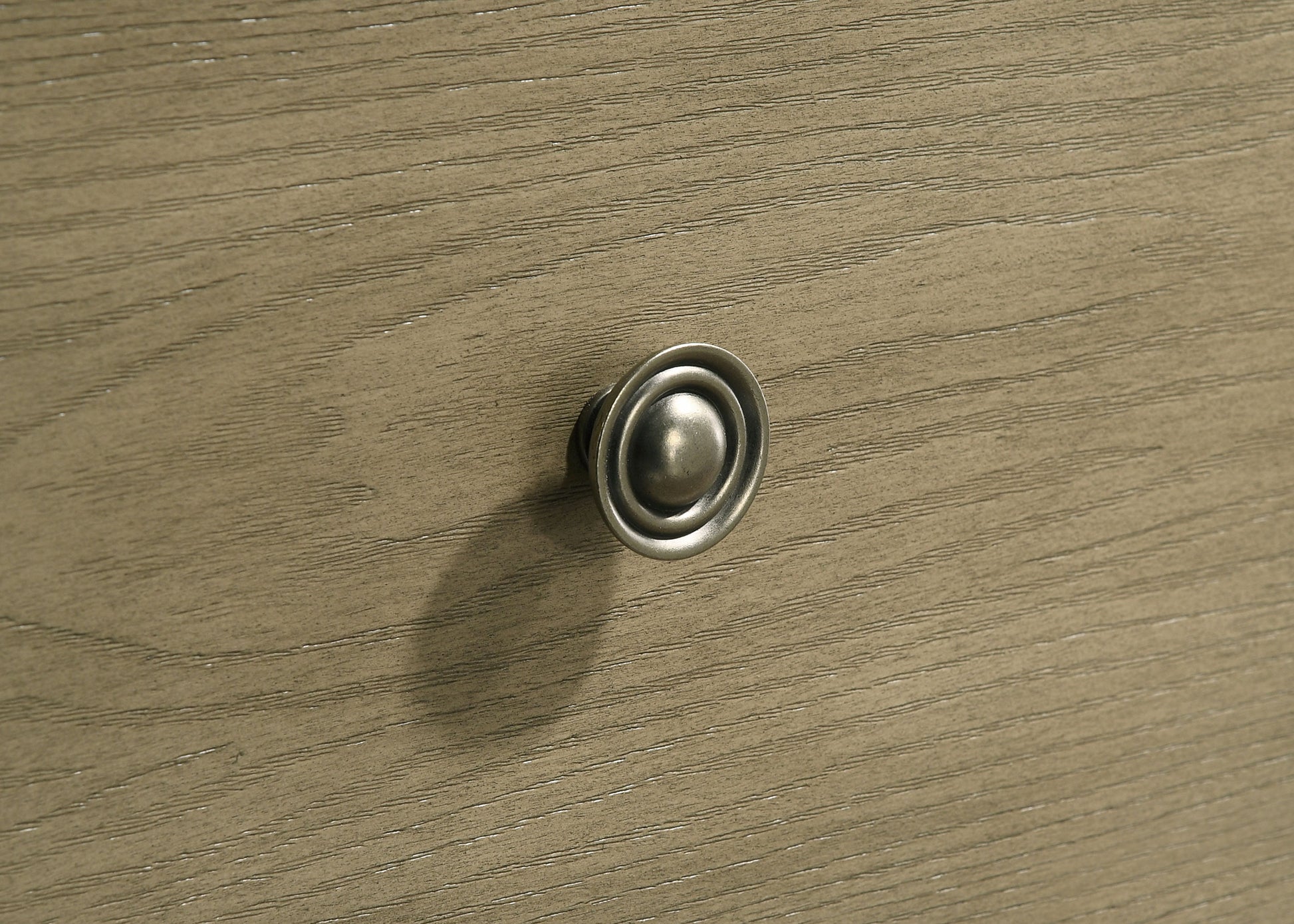 - Antique nickel metal knobs offer a refined accent to the oak grain texture