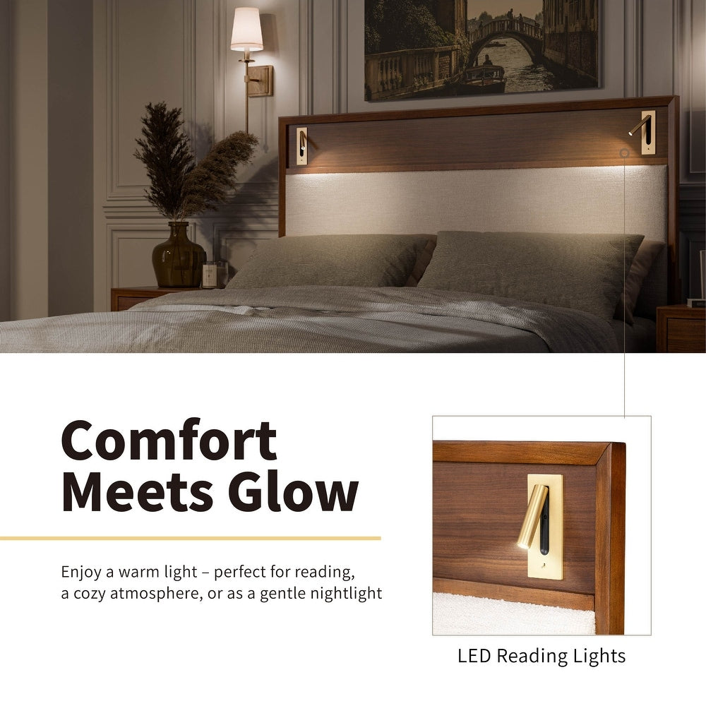 Elevate your bedroom with this Mid-Century Modern Walnut Bedroom Set, combining sleek design with functional details. Crafted from solid wood, rubberwood, walnut veneer, and engineered wood, this set features a mattress-ready platform bed with an upholstered headboard and built-in LED reading lights for a stylish yet practical touch. The gold-capped legs add a retro-inspired accent, while the nightstand includes a USB port and LED light for modern convenience. Built for durability, the ball-bearing glides and English dovetail construction ensure smooth operation on all storage pieces. A beveled mirror completes the set, adding depth and sophistication to your space.