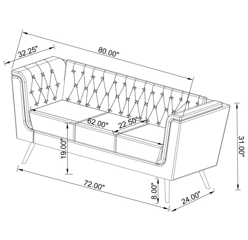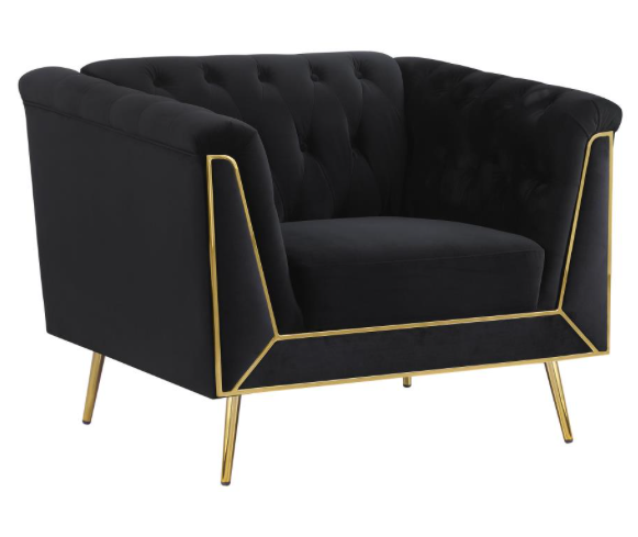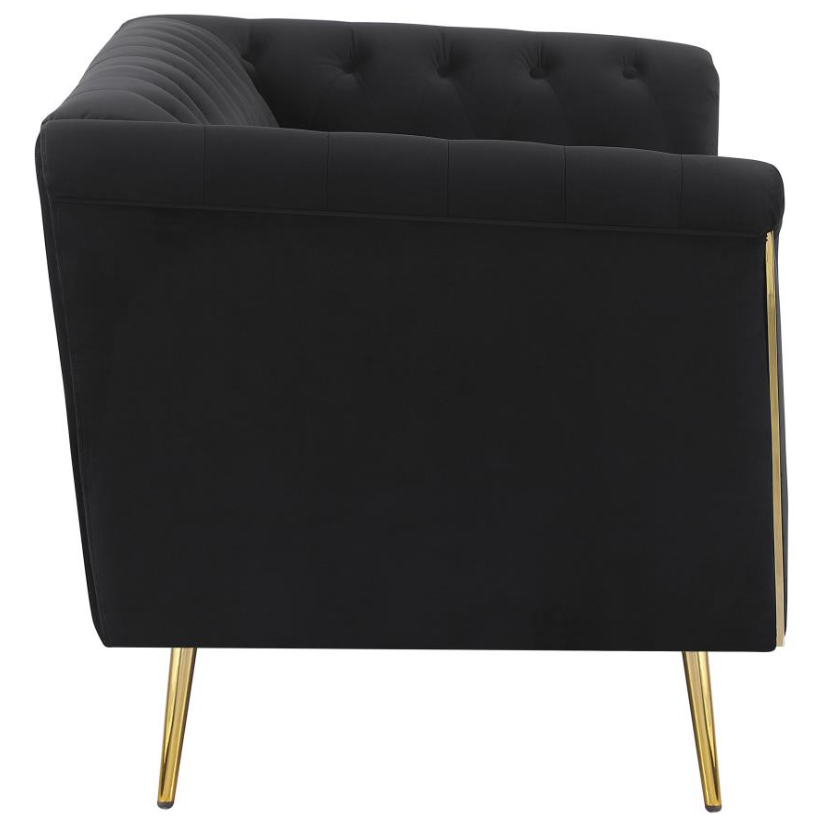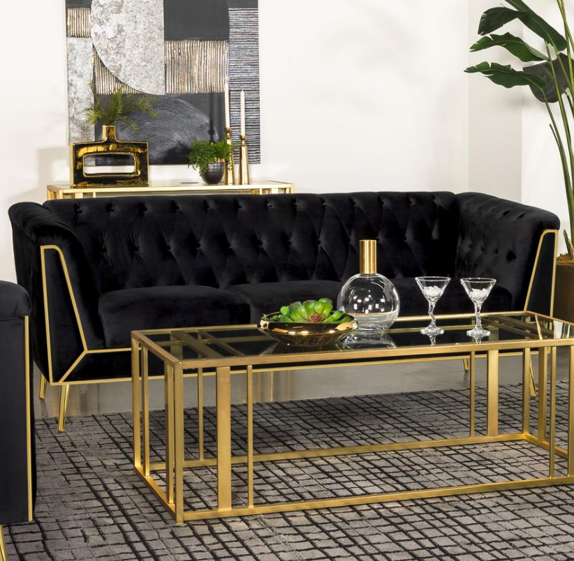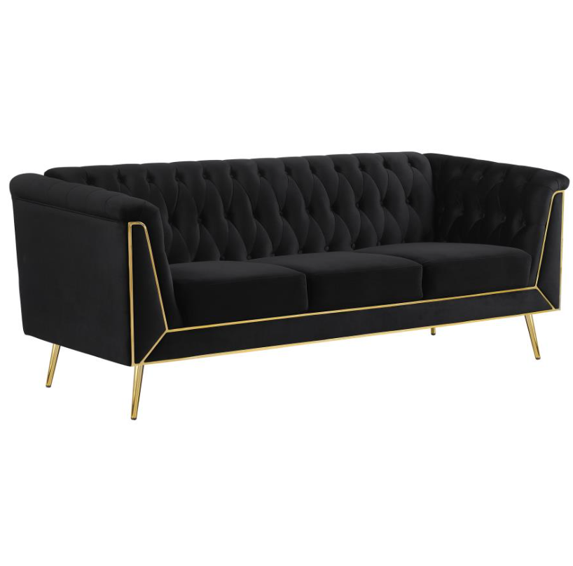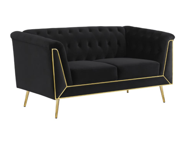 Instantly upscale your elegant living room with a two-piece modern glam sofa set. The sofa and loveseat show off lush, inviting black velvet upholstery, complete with button tufting that adds dimension to a vintage inspired silhouette. High arms add character and are accentuated with geometric metal trim work in a shiny gold finish to create wonderful contrast and detail. Matching legs are tapered and splayed, a perfect finishing touch. Sinuous springs and webbing provide support to plush seating, with foam cushioning for exceptional comfort and support.