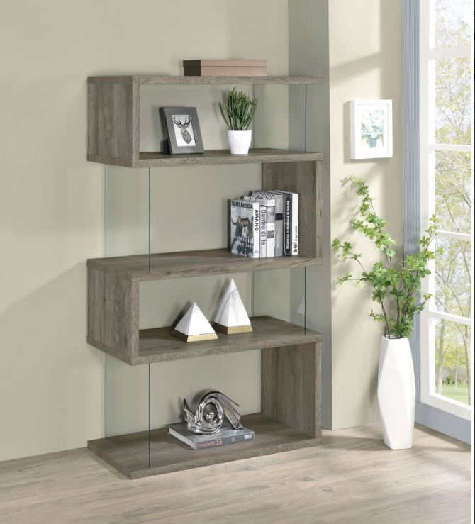 The asymmetrical zig-zag design of this contemporary bookcase creates a focal point in any room. Five open shelves in a light grey driftwood finish stack elegantly, supported by clear glass side panels that lend a modern flair to this furniture piece. Perfect for home offices, living rooms and much more, showcase anything from a book collection, decor, and other favorite items for all to see. With a flush base, this open bookcase unit rests sturdily and securely on the floor. Clean lines and a wonderful jagged design offer up style, functionality, and a stunning display.