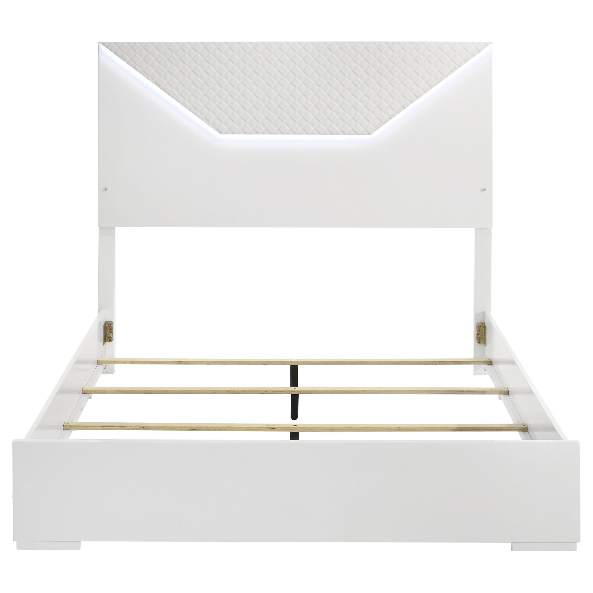 Bring sleek sophistication into your bedroom with this stunning bed, finished in a bright white polyurethane high gloss for a clean, modern look. The headboard features a striking 3-dimensional diamond tile emboss that creates texture and visual interest. Integrated touch LED lighting adds a warm glow, making it both stylish and functional. With its low-profile silhouette and durable construction, this bed is the perfect centerpiece for a contemporary retreat.