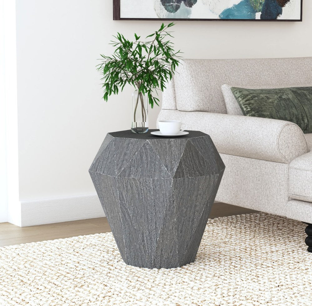 Inspired design meets exceptional craftsmanship in a modern wood side table. This dynamic design is influenced by the classic cut of a sparkling gemstone, offering faceted elegance and refinement. Made from wood that adds earthy character, the table is a stunning mix of glam and organic design elements. It looks great in an entryway with a simple vase of flowers and makes an equally stylish statement complementing living room seating. Mango wood is rich is dimension and grain texturing, adding the perfect hint of depth to the overall look.