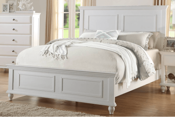 Brighten up your space with the Jenny Farmhouse collection in white by Poundex. This beautiful panel bed features a 50" tall headboard with window pane paneling and clean straight lines. The bed sits on turned feet to finish a perfect farmhouse style.