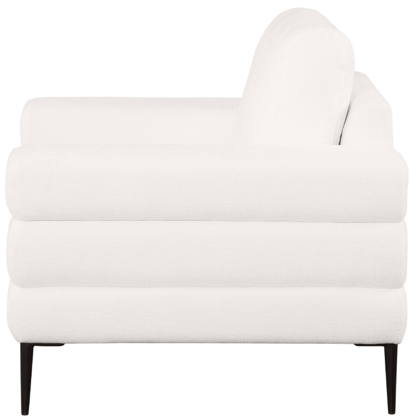 Elevate your living space with this ivory sofa, crafted with a focus on modern sophistication. The tube-like geometric sculptured track arms provide a unique and stylish design element that sets this piece apart. Wrapped in beautiful ivory chenille basket weave fabric, the sofa exudes elegance and offers an inviting seating experience. The supportive reversible back cushions ensure comfort and can be easily flipped for even wear and extended use. Thin metal legs add to the modern appeal, creating a light and airy look while providing a sturdy foundation.