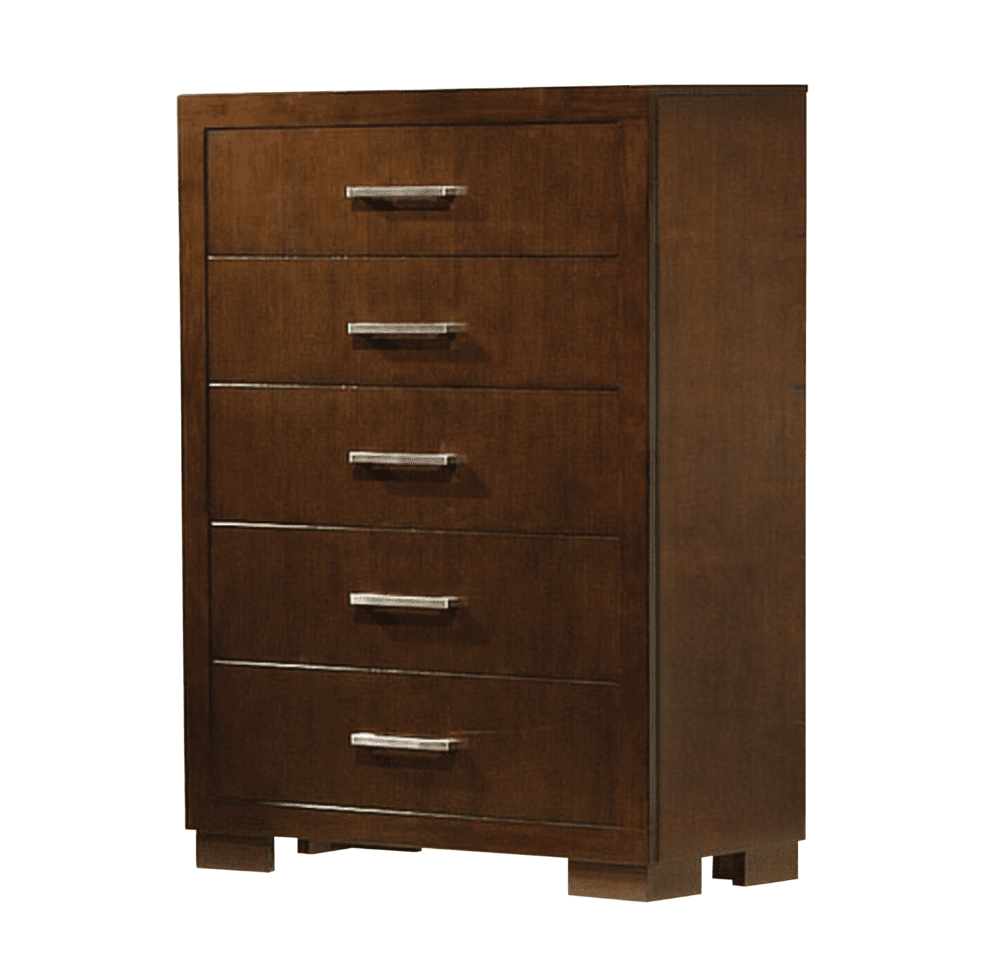 - 5-Piece Set: Bed, Dresser, Mirror, Nightstand, Chest