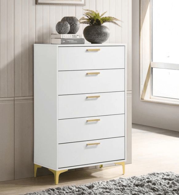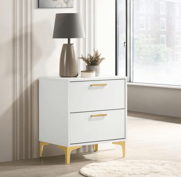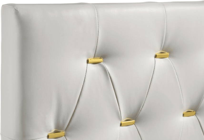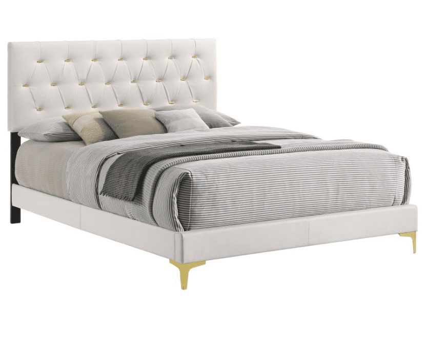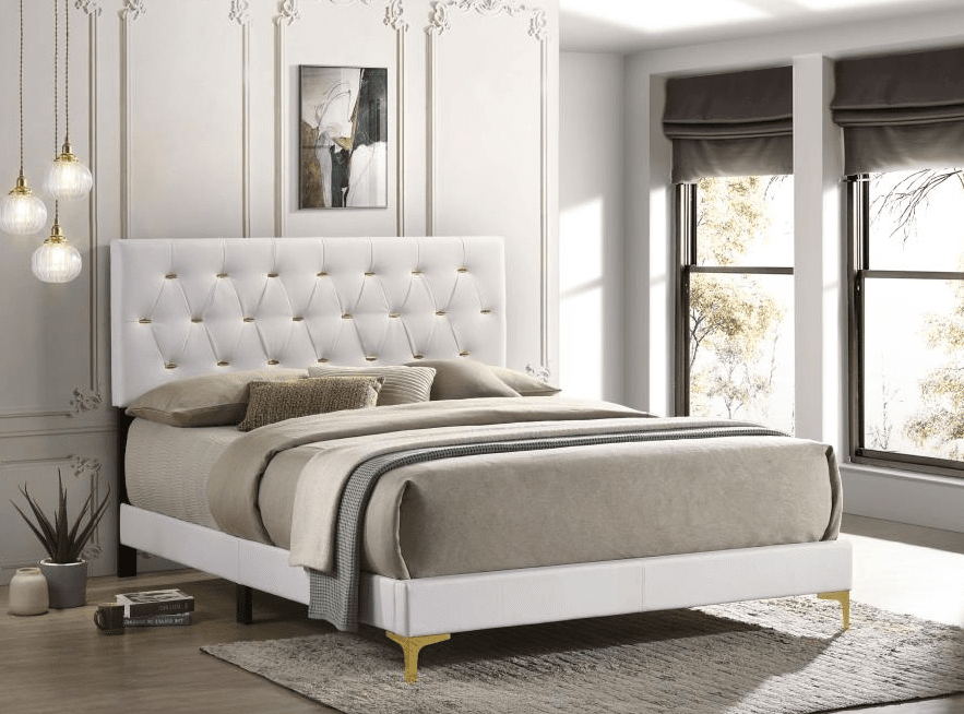 Instantly elevate the look of your bedroom oasis with this modern glam bedroom set. Chic, warm, gold elements lend a luxe accent to the upholstered platform bed and accompanying pieces. The bright, white finish sets the stage and offers a clean, contemporary aesthetic with a light and airy expression. The lovely headboard takes your breath away with its diamond tufted design and striking bar button details. Matching the warm, golden buttons are gold bracket legs, adding elevation to the bed and a retro-inspired look and feel.