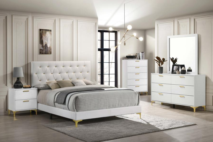 Instantly elevate the look of your bedroom oasis with this modern glam bedroom set. Chic, warm, gold elements lend a luxe accent to the upholstered platform bed and accompanying pieces. The bright, white finish sets the stage and offers a clean, contemporary aesthetic with a light and airy expression. The lovely headboard takes your breath away with its diamond tufted design and striking bar button details. Matching the warm, golden buttons are gold bracket legs, adding elevation to the bed and a retro-inspired look and feel.