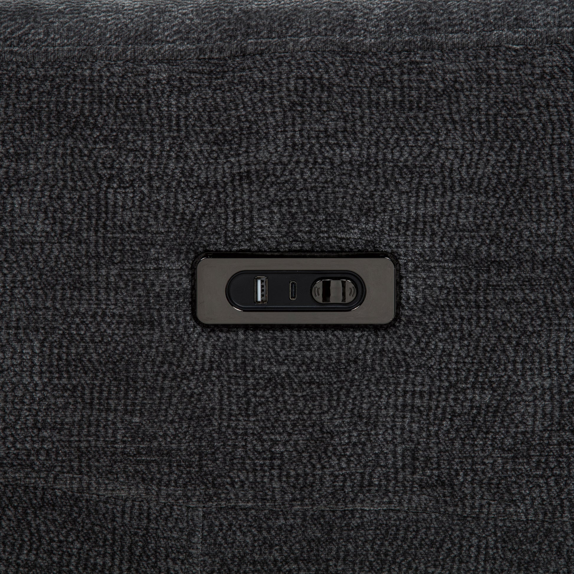- Soft dark gray chenille upholstery with a refined woven texture