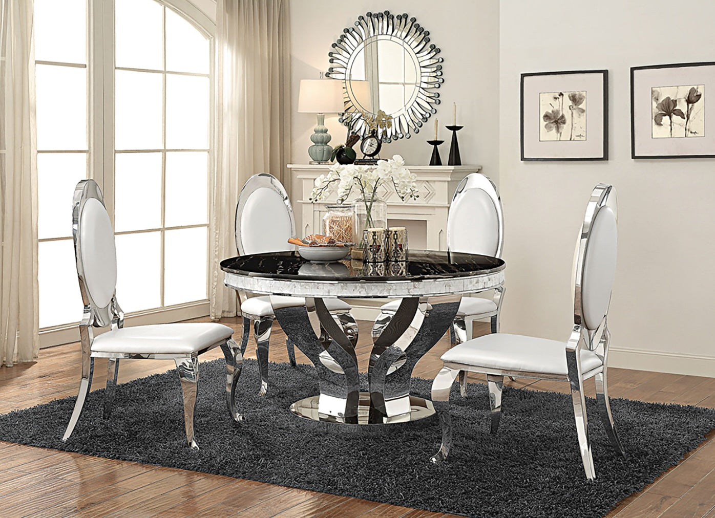 Bold, modern and inspired by Art Deco decor, this round five-piece dining set a statement-making addition to your dining room. The tabletop is incredibly crafted with real black marble, which makes an eye-catching statement against the mosaic shell tiles apron. The ornately carved table base is finished in chrome and plays off of the cabriole style legs of the four dining chairs. Each dining chair is armless in design and features sensationally soft creamy white leatherette fabric to contrast the tabletop. Choose this modern and Art Deco style dining set that serves as a work of art in your home.