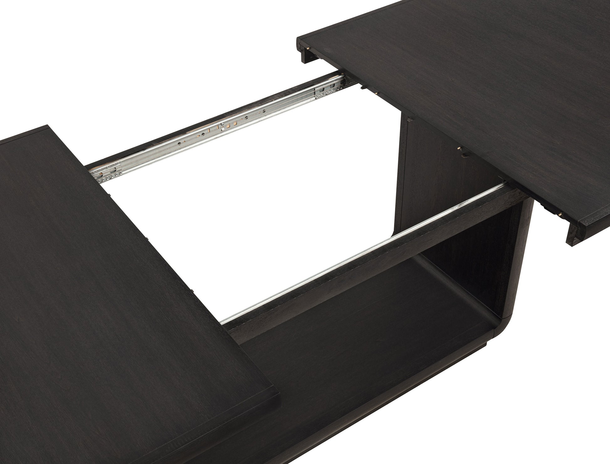 - Rectangular dining table with sculptural pedestal base and removable extension leaf