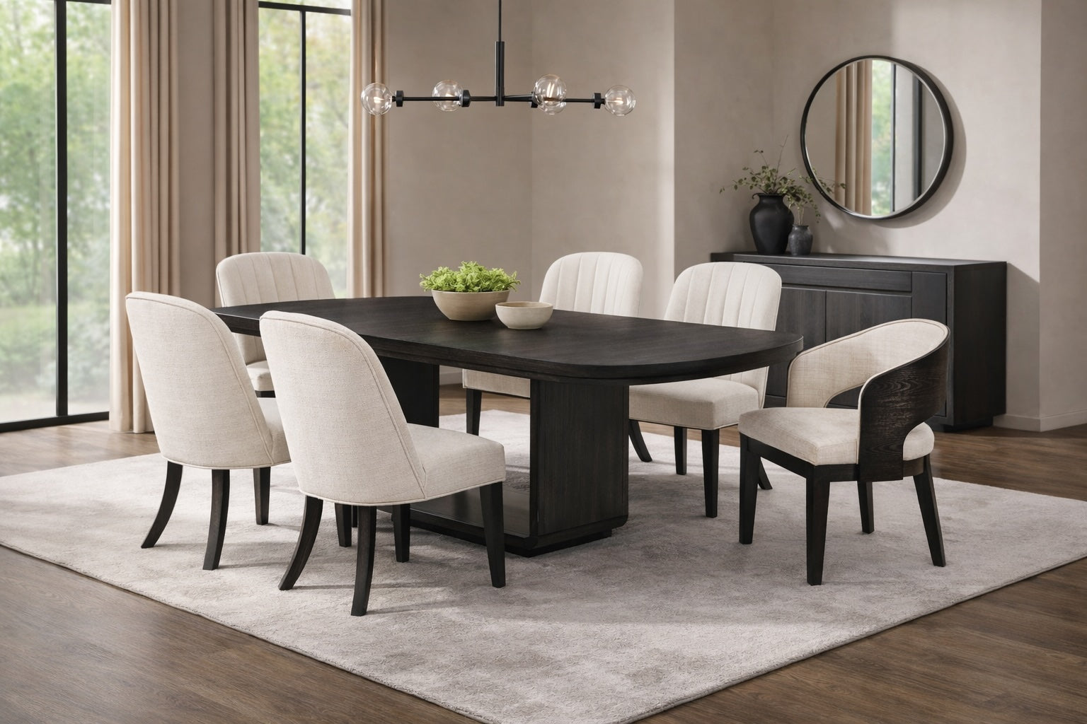 At each end of the table, curved barrel-back arm chairs offer a welcoming silhouette, while softly channeled side chairs line the center with tailored texture. Cream upholstery lightens the composition, creating contrast against the rich wood finish for a dining setting that feels modern, grounded, and timeless.