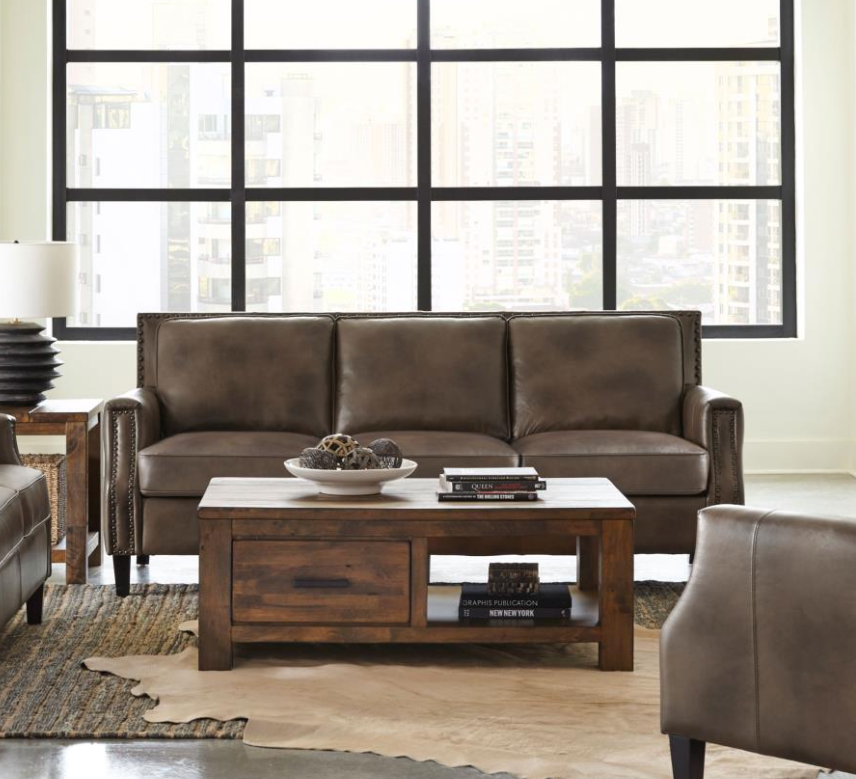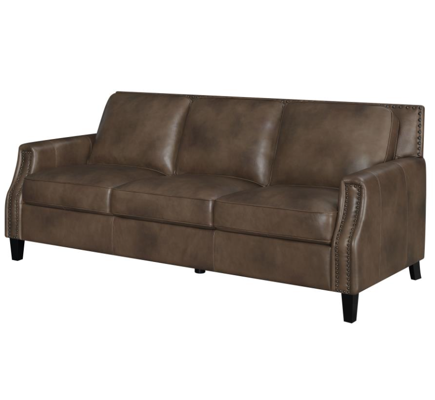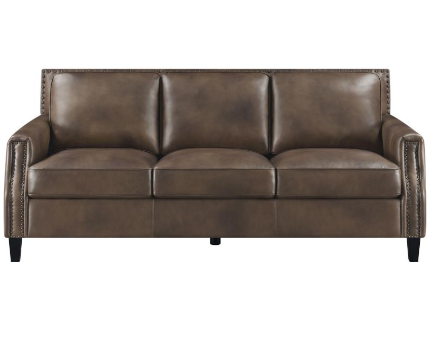 Wrapped in a smooth mottled top grain leather in a warm brown sugar hue, this seating set lends a neutral tone that complements a living room's existing color palettes. Perfectly suited for a modern farmhouse home, this seating set offers many transitional elements such as sleek recessed arms that gently slope off toward the front. Along each arm interior facade and backrest are individually hammered nailheads in an antique brass finish. Plush back cushions and tailored boxed seats offer long-lasting support and comfort for family and guests. In addition, matching welt trim lines each cushion, adding a classic look.