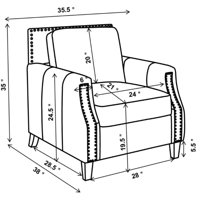 - Thin recessed arms with broken front arm panels, detailed with small individually hammered antique brass nailheads