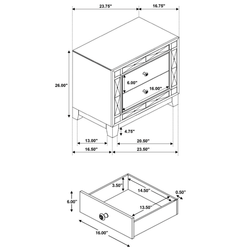Glamorous and streamlined, this transitional two-drawer nightstand is full of chic details. Designed for a stylish bedroom, the sleek silhouette rests on retro-inspired tapered and angled legs. The drawers are accented with etched mirror panels and crystal-style knobs, adding a radiant, glamorous touch. Finished in shimmering metallic mercury, this nightstand enhances the light and spaciousness of any room, making it a fashionable statement piece for glam or contemporary interiors.