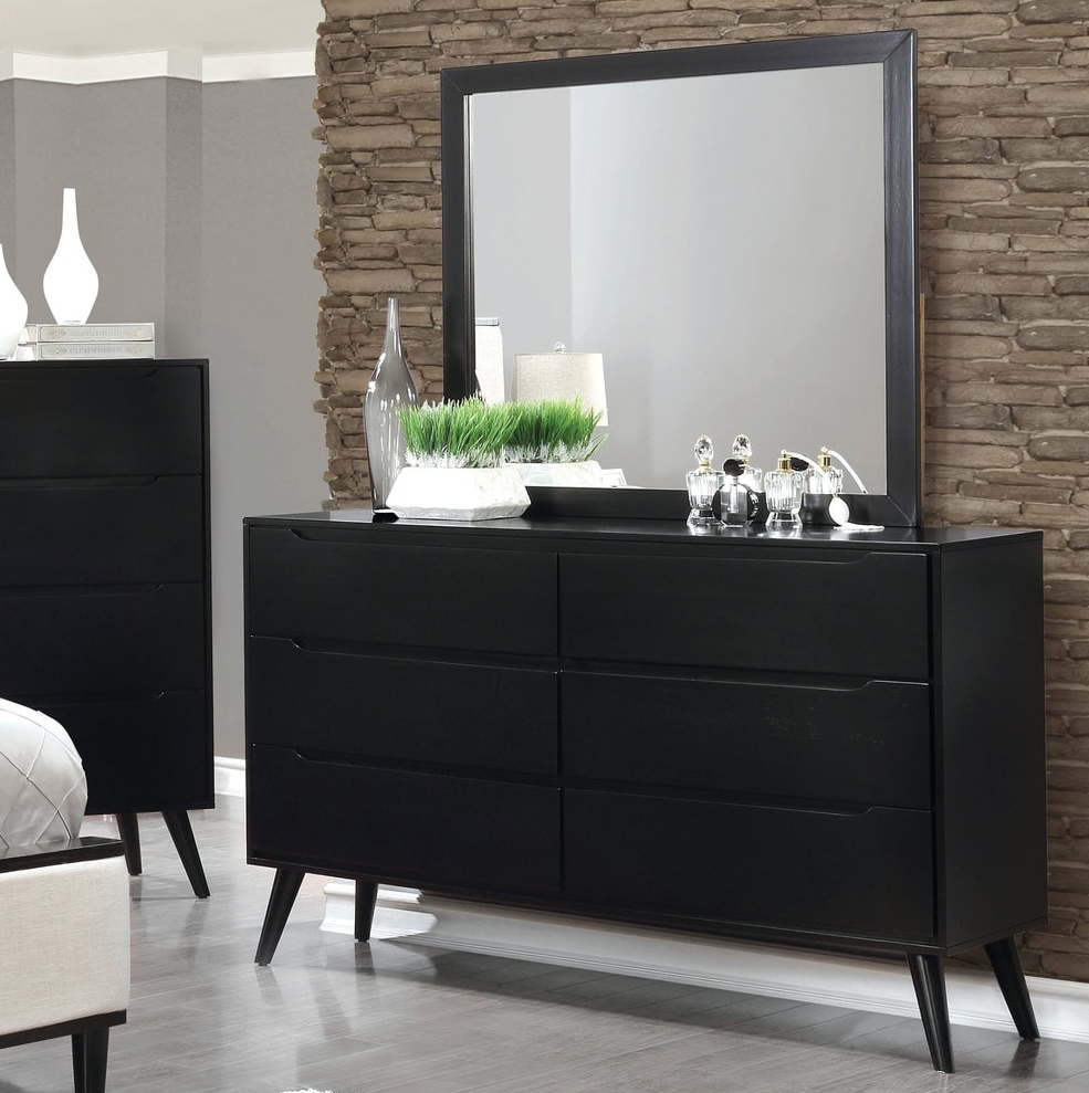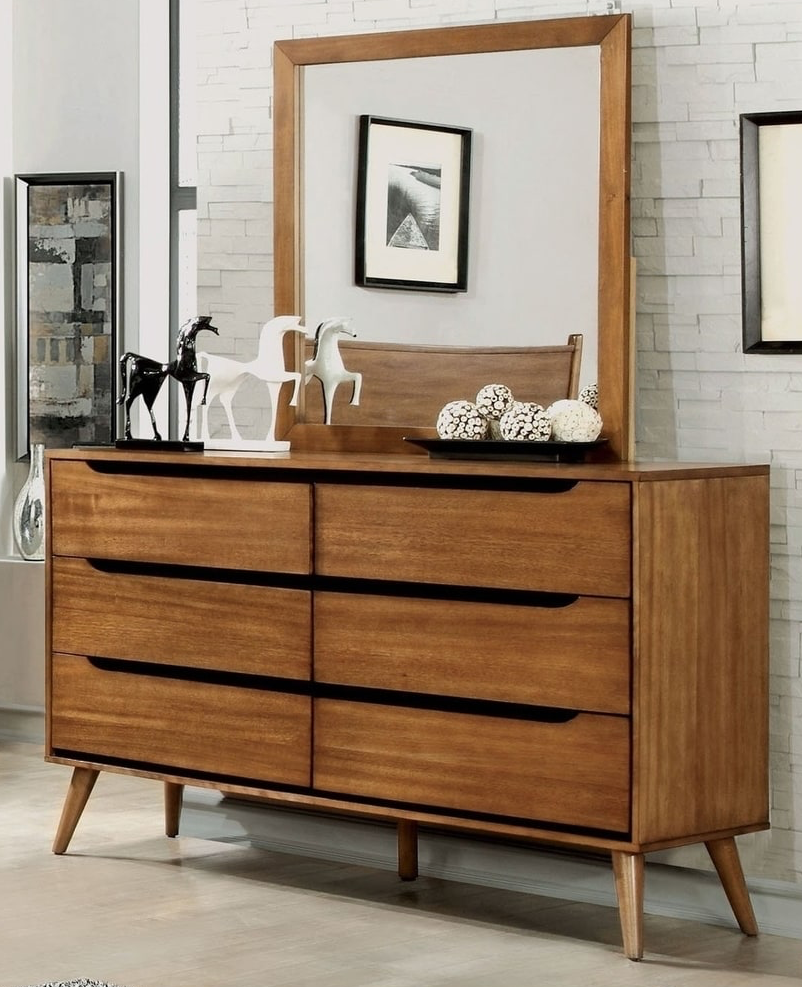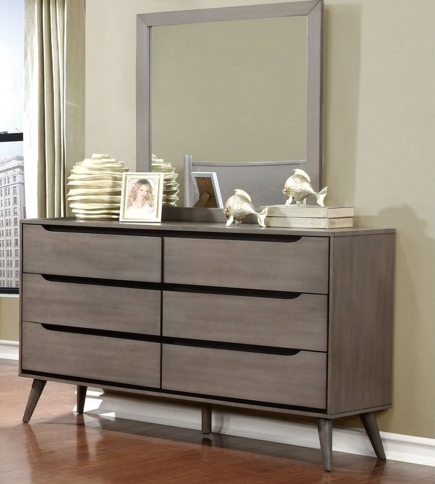With a charming retro influence, the design of this Mid-Century Modern gray wood six-drawer bedroom dresser and mirror set harkens back to a romantic era and brings a nostalgic element to home decor. The Fopp wood dresser and mirror set from Furniture of America delivers on style with elegant simplicity and a laid-back vibe. Built from solid wood and veneer, it begins a transformation in a carefree casual bedroom. Natural distressing is subtle and stylish, as full extension metal glides and smooth panel fronts on six drawers feature period-specific cutout handles. A felt-lined top drawer is perfect for protecting valuables. Splayed rounded, tapered legs offer iconic Mid-Century character. A rectangular mirror with a gray finish frame completes its look.
