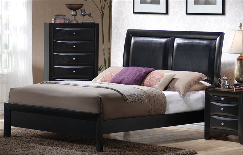 This stunning contemporary bed will add a touch of sophisticated style to your master bedroom. The high slightly curved headboard features two plush bi-cast leather panels for a luxurious look, while a smooth black frame with low profile footboard and chambered edges creates a sleek balance. Pair with the coordinating collection items for a harmonious style in your calming bedroom.