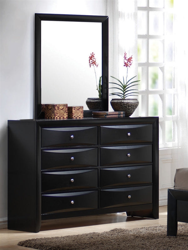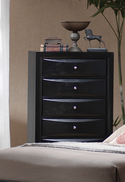 Collection Description The cool, contemporary Liana collection will give your master bedroom a modern update with a refined look and feel. The pieces have sleek cases, with chambered trim, chambered drawer fronts, and brushed chrome knobs for a sophisticated look. Choose between several different headboard and footboard choices, all in a unique contemporary style that will be a modern centerpiece to any master bedroom. Spacious storage options make these pieces practical in addition to a stylish look. Finished in a glossy Black finish, these pieces have a luxurious look that you will love for years to come.