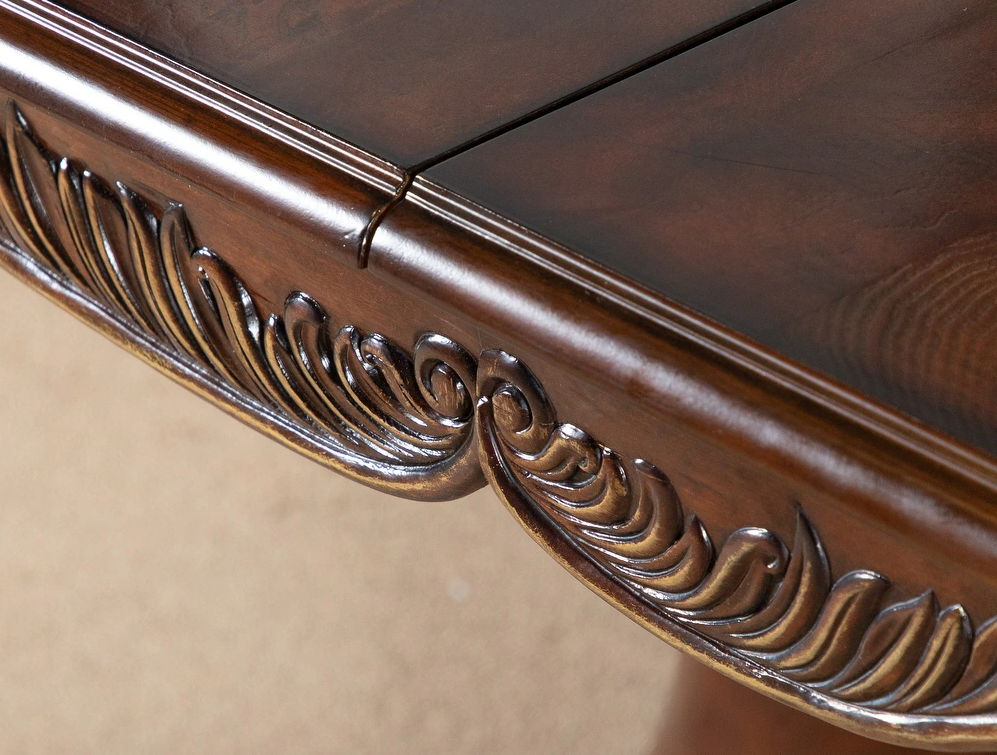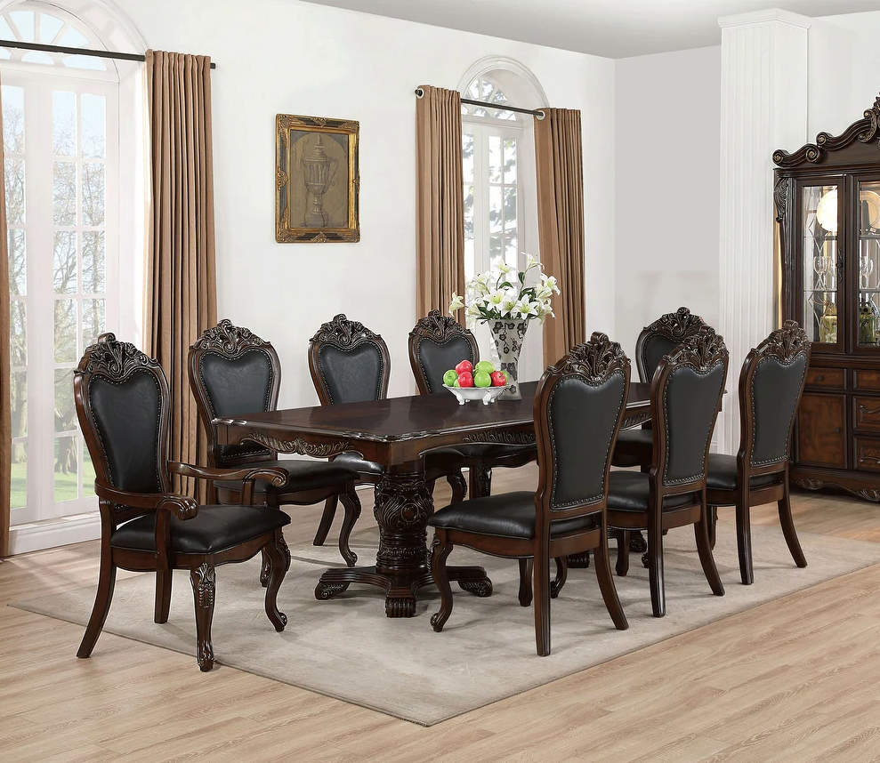 - Table's double pedestal base with intricate carvings adds a touch of elegance